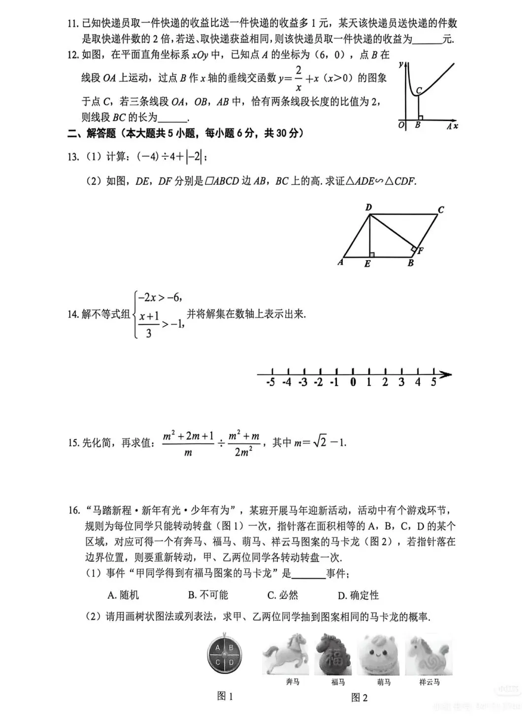 1. 基础解答题(13-16题):实数混合运算、一元一次不等式组求解、分式化简求值、概率统计,全卷基础得分核心板块,考查学生基本计算与基础解题能力,分值占比高