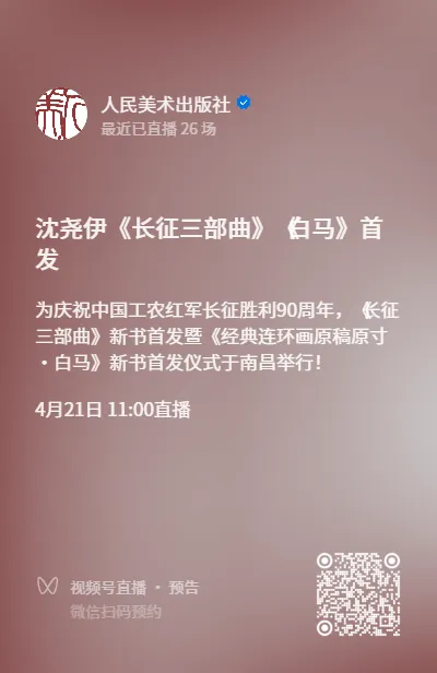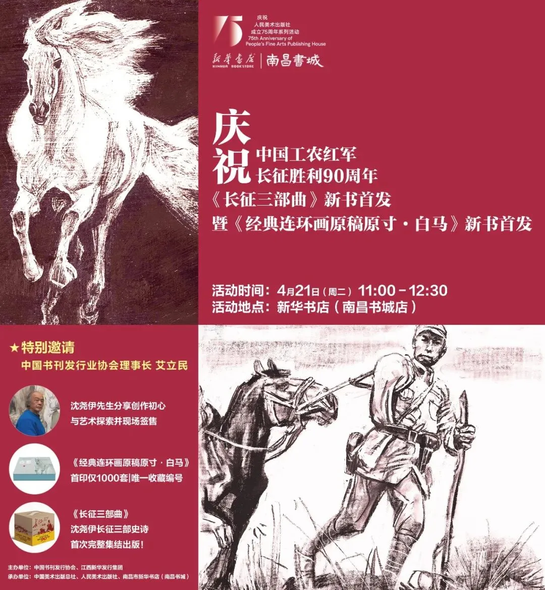 2026年4月21日上午11:00,著名画家、史诗级连环画《地球的红飘带》作者沈尧伊先生将亲临南昌市新华书店(南昌书城店),出席“庆祝中国工农红军长征胜利90周年《长征三部曲》新书首发暨《经典连环画原稿原寸·白马》新书首发”活动,并举办现场签售!
