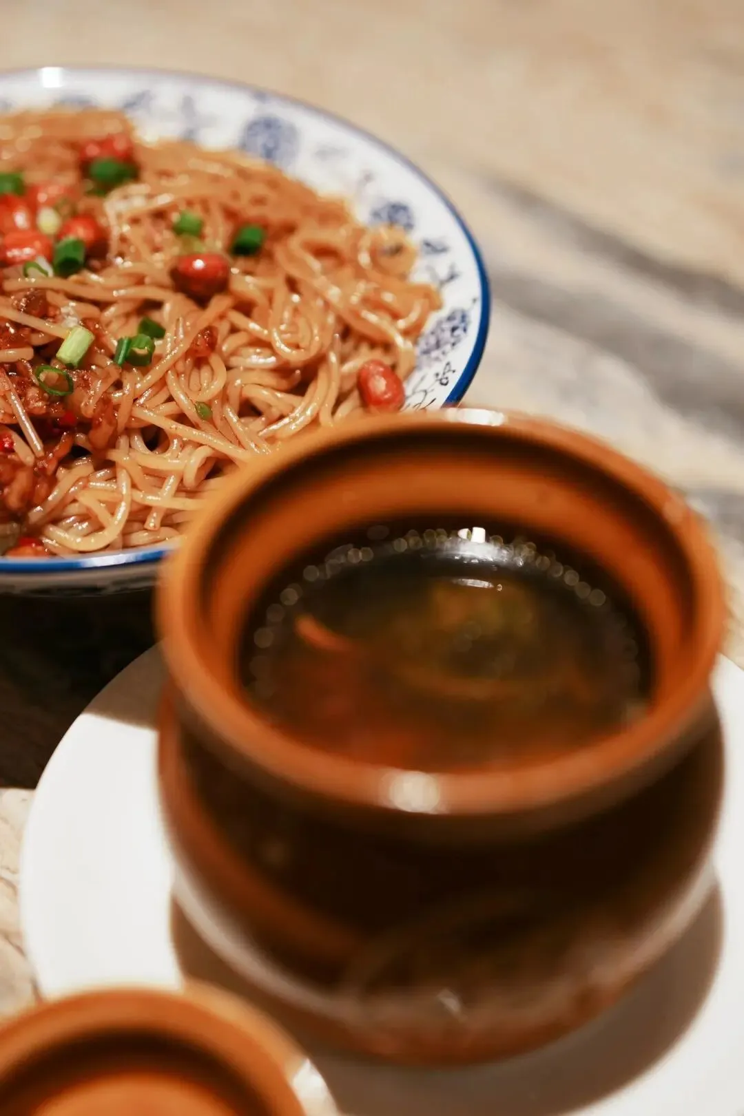 南昌人的一天,必然被南昌拌粉+瓦罐汤这对黄金CP唤醒。爽滑劲道的手工米粉,淋上秘制酱油与红油,搭配脆爽萝卜干、酸豆角、香脆花生,充分拌匀后,香气瞬间迸发。麻辣开胃,米香浓郁,简单却回味无穷。