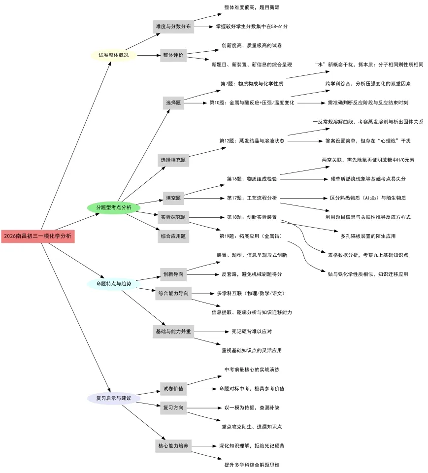 整体难度:南昌市一模化学有难度,题目新颖,看得出创新之处,巧妙将所学内容以新题目新装置新信息的形式展现出来,预测,绝大部分平时化学学的不错的孩子分数主要集中在58-61分