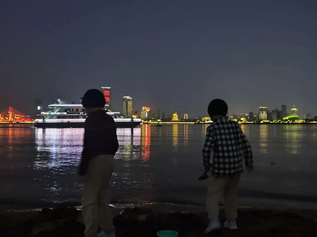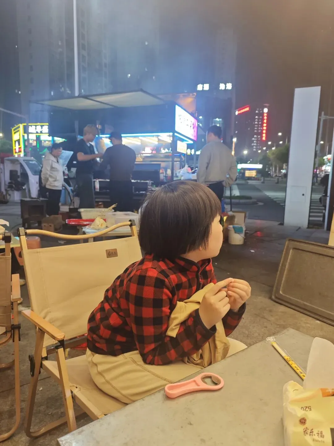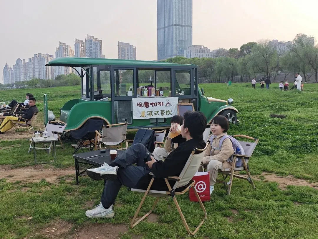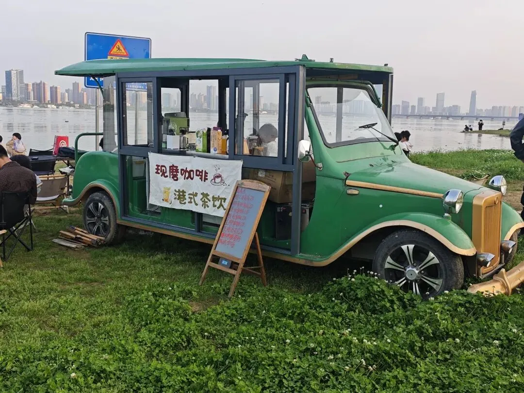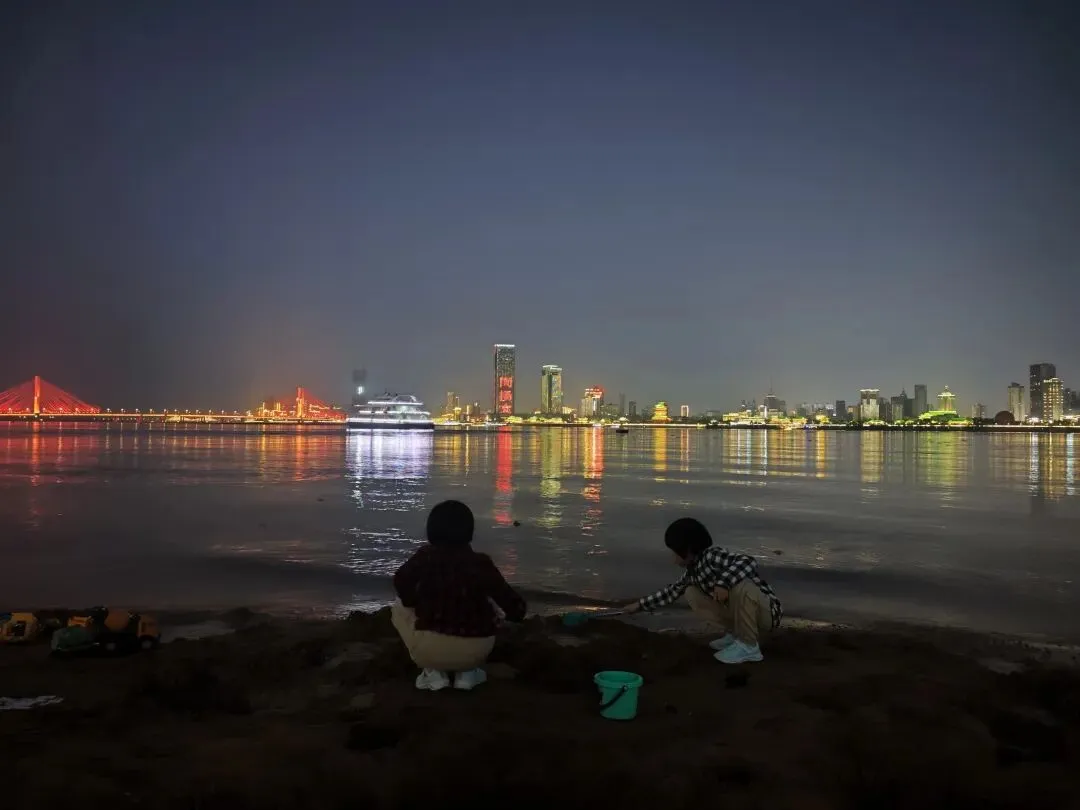 这次到江边,还发现了一辆咖啡车,之前没发现过,估计是节假日才出摊。老板有提供露营椅,我们点了两杯,在江边一边喝咖啡,一边等天黑看喷泉,甜蜜当然是最高兴了,在江边玩水玩沙子,玩累了还能有地方坐着休息。其实后来我们发现不点咖啡饮料,也能坐下来休息,老板也不会来驱赶你,就是给你一种相当和谐的感觉,散发出一种松弛感。