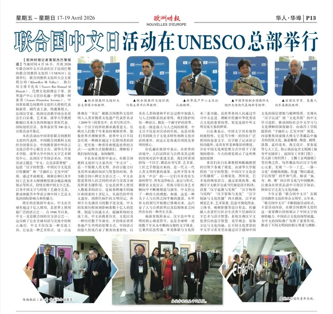当地时间4月16日,庆祝2026年联合国中文日活动在位于法国巴黎的联合国教科文组织总部举行。联合国教科文组织大会主席塔尔哈、执行局主席辛扎布、代理文化助理总干事、世界遗产中心主任拉扎赫·伊伦都·阿索莫,中国常驻联合国教科文组织大使衔代表杨新育、副代表王盈,特邀策展人法国汉学家、欧洲汉语教学协会名誉会长白乐桑,南昌工学院副理事长、南昌应用技术师范学院校长陶也青,以及来自各国和地区常驻代表、国际组织官员、各界嘉宾等300余人出席活动开幕式。