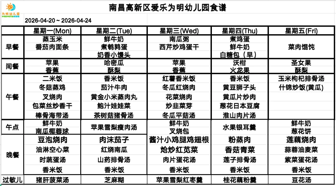 >南昌高新区爱乐为明幼儿园周营养食谱(2026.4.20—2026.4.24)