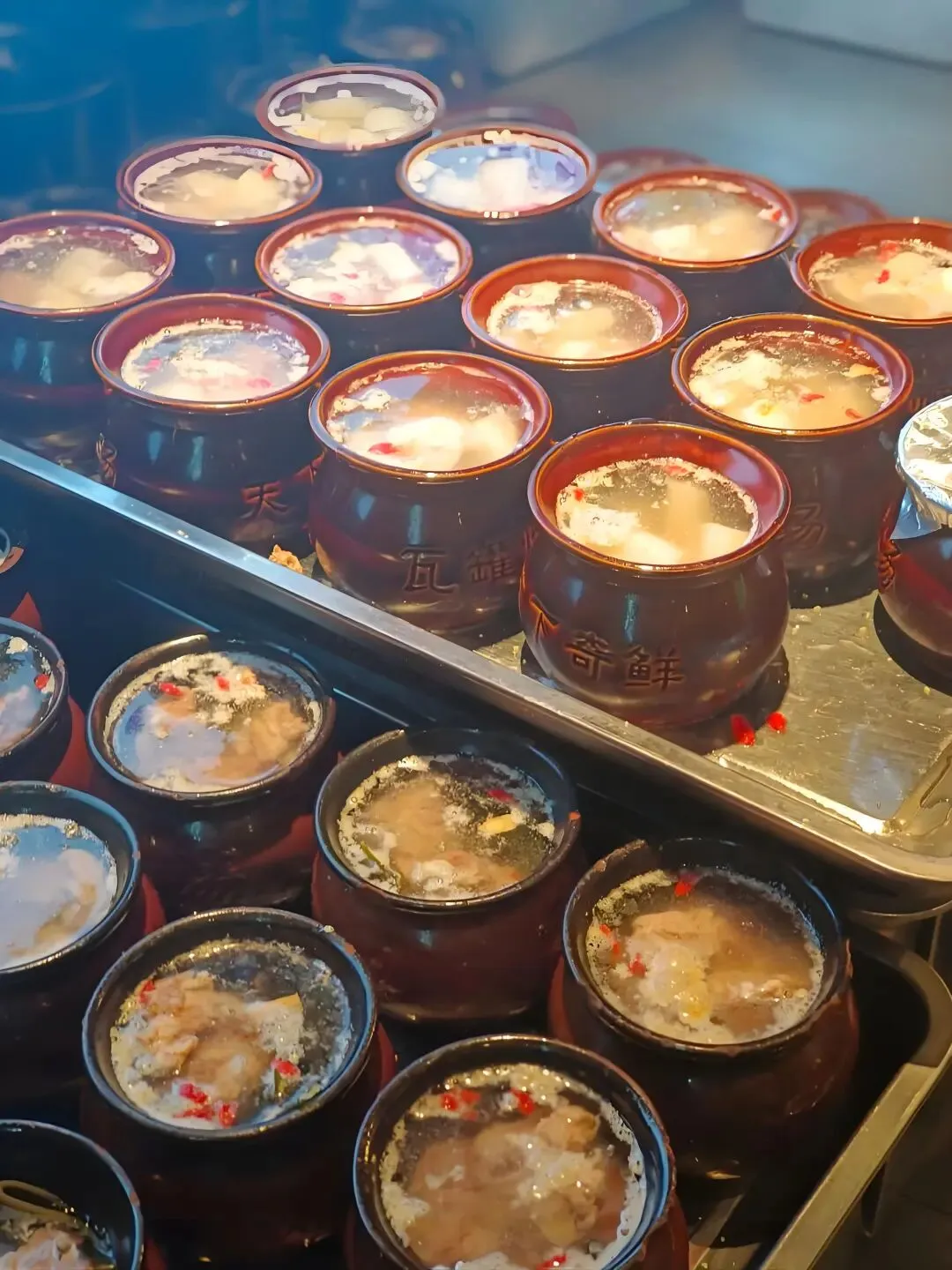 它采用传统的大瓦缸炭火慢煨工艺,将一个个小巧的土瓦罐整齐码放在瓦缸内,以木炭文火慢煨3-4小时,不添多余调料,只靠食材本身的鲜味,慢慢熬煮出最纯粹的汤汁。