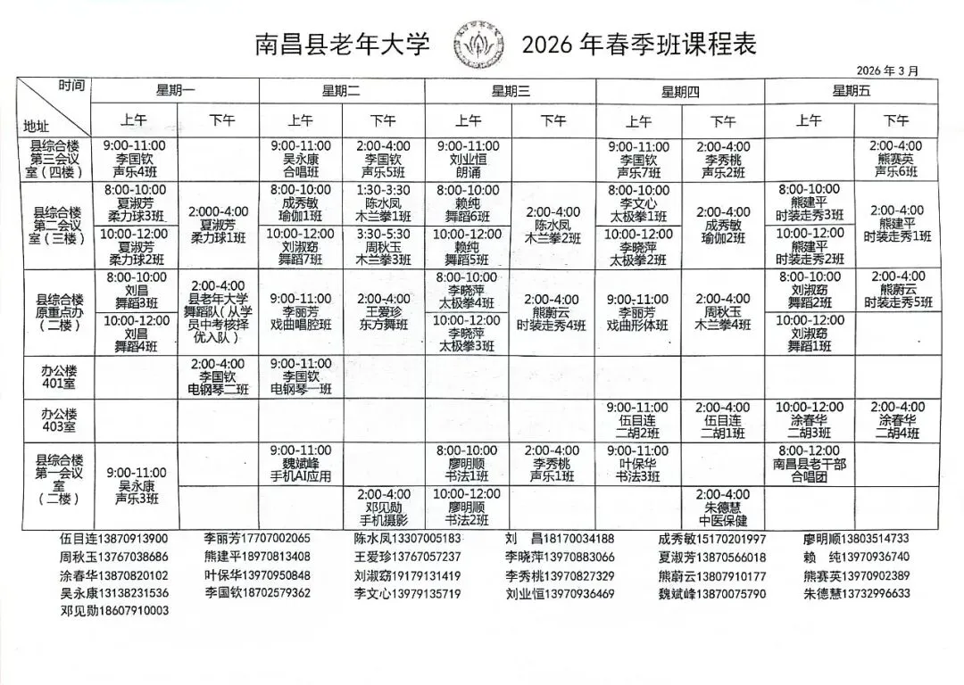 南昌县老年大学成立于2006年9月,是县委老干部局举办的一所以满足老年人兴趣爱好和学习需求的公益性学校。学校位于老县政府大院内(莲塘镇五一路458号)。经研究,2026年春季招生工作现在开始,现将有关事项通知如下:
