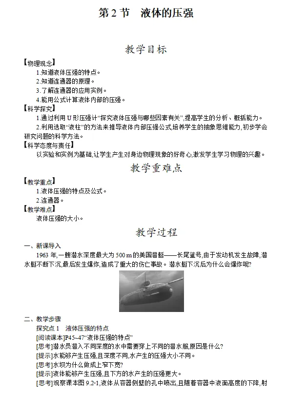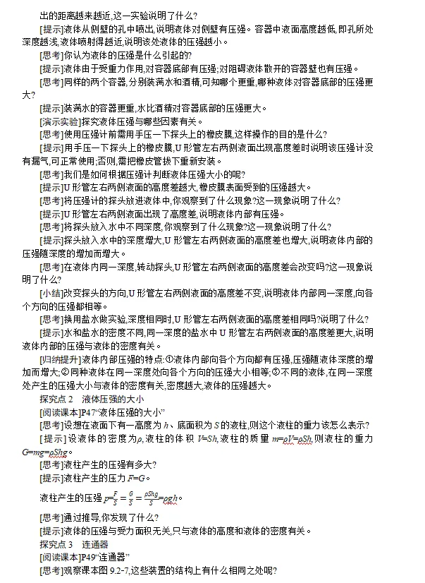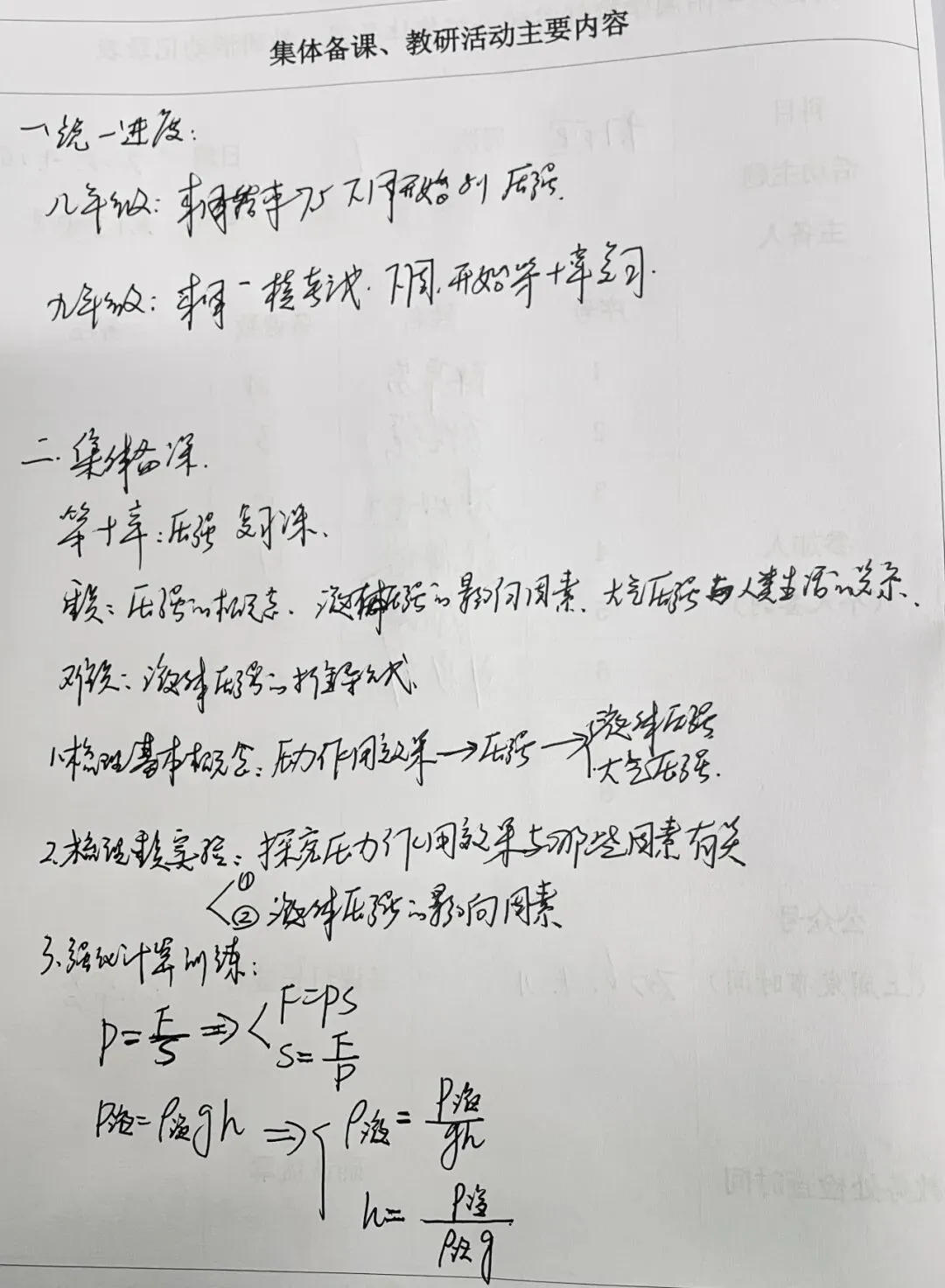 本次集体备课以“8.2液体压强”为核心内容。明确教学目标为引导学生认识液体压强的特点 。在剖析教学重难点时,一致认定液体压强实验及计算是关键。教师们精心打磨实验设计,确定采用控制变量法与转换法,借助U形管压强计、盐水、清水等器材,助力学生直观理解知识。