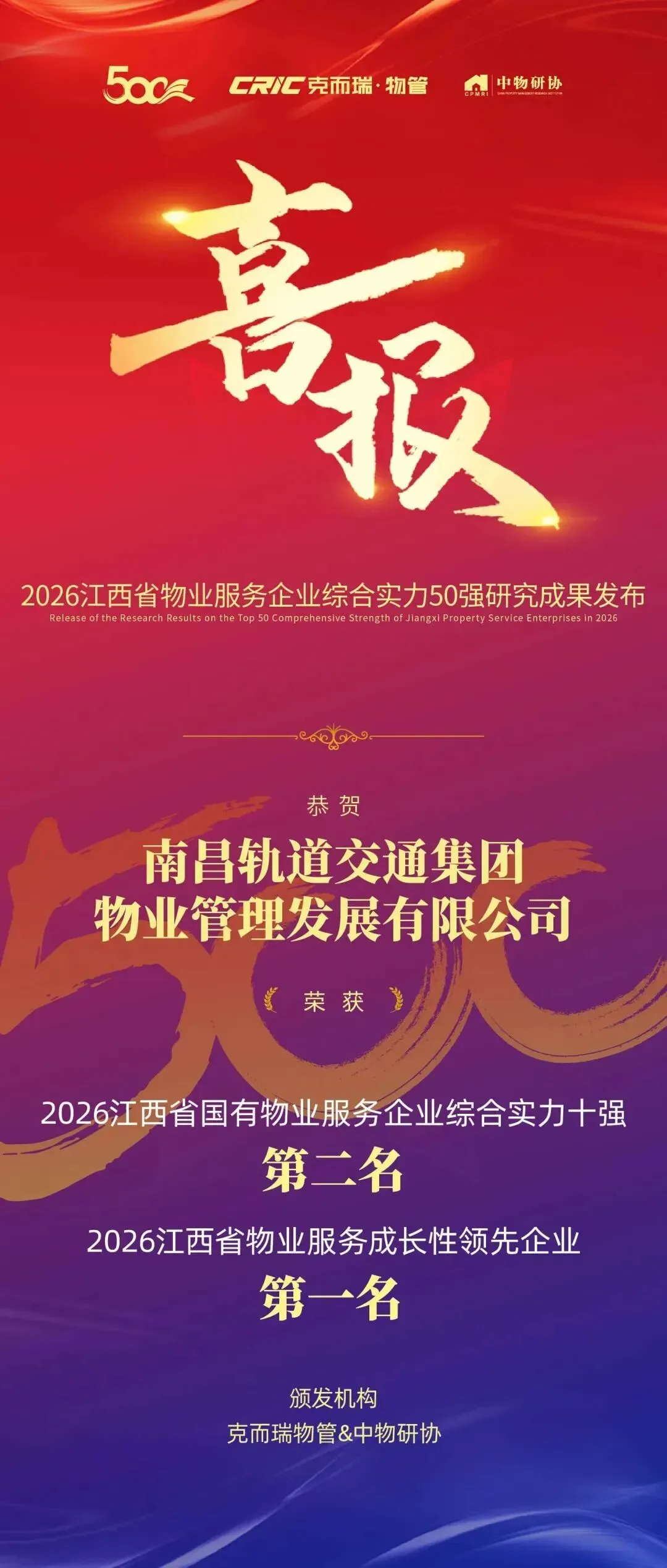 其中,物业公司荣获“2026江西省国有物业服务企业综合实力十强 第二名”及“2026江西省物业服务成长性领先企业 第一名”两项殊荣。这不仅是对公司近年来快速发展与稳步提升的充分肯定,也标志着其在国有物业服务企业阵营中持续占据前列位置,展现出强劲的成长动能与市场竞争力。