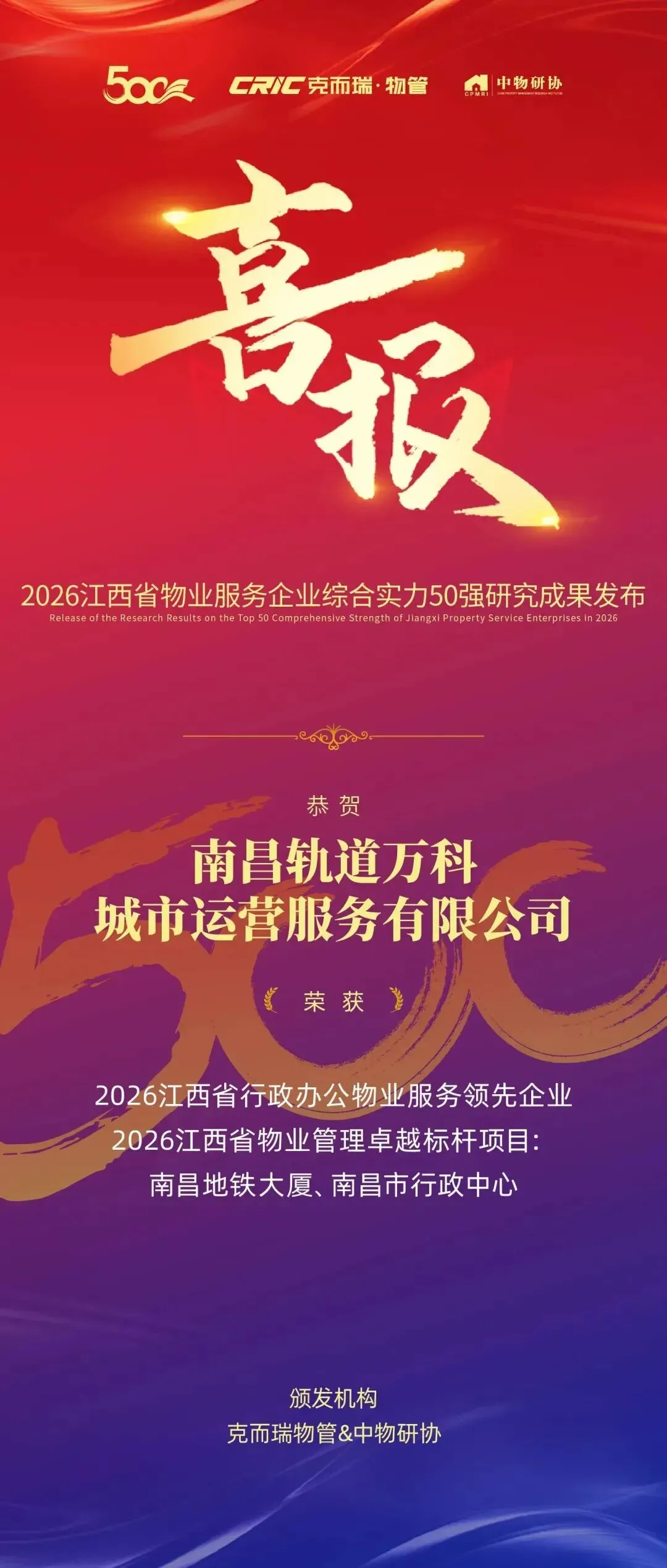 同时,南昌轨道万科公司凭借在行政办公物业服务领域的专业化、精细化表现,荣获“2026江西省行政办公物业服务领先企业”称号。此外,由该公司提供服务的南昌地铁大厦、南昌市行政中心两个项目,双双获评“2026江西省物业管理卓越标杆项目”,成为全省物业服务项目中的优秀代表。