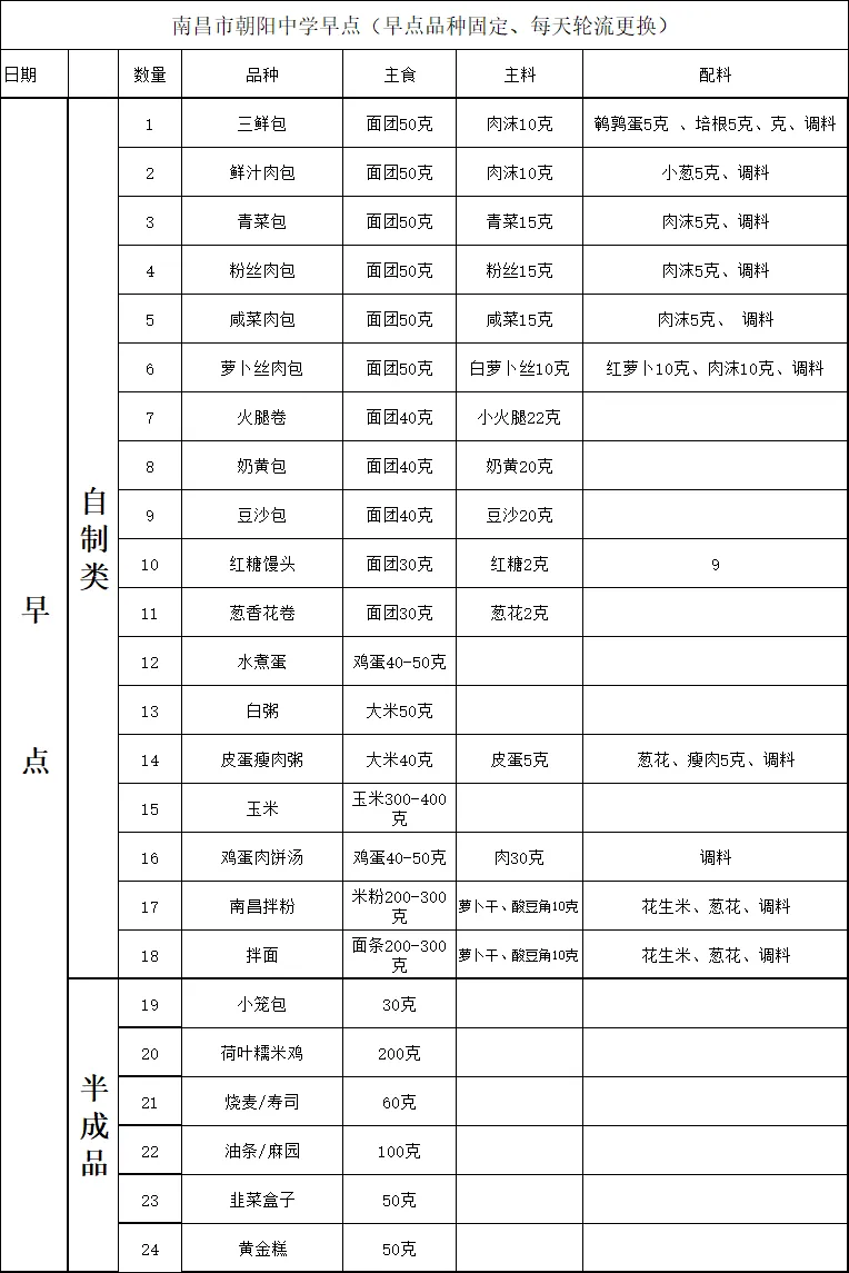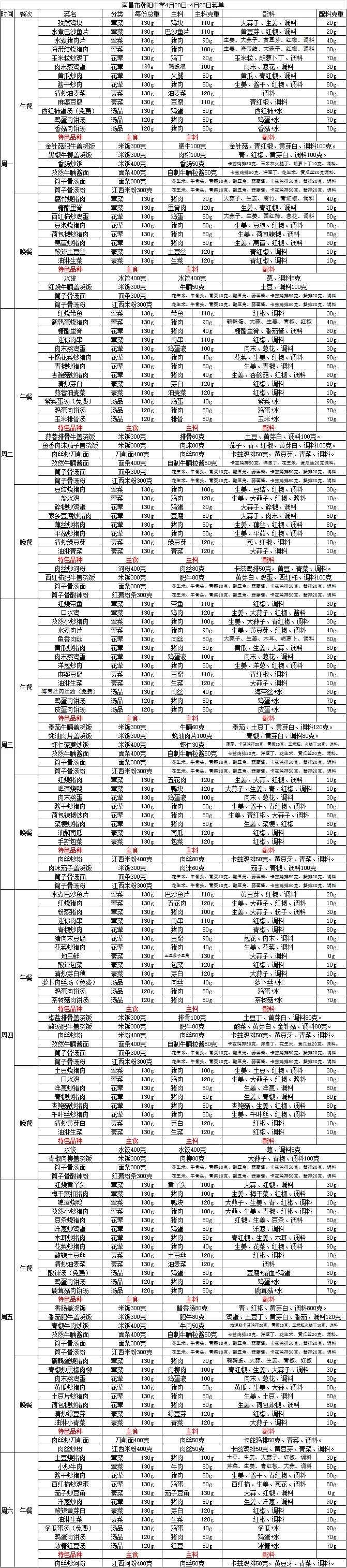 南昌市朝阳中学食堂周菜单(4月20号—4月25号)