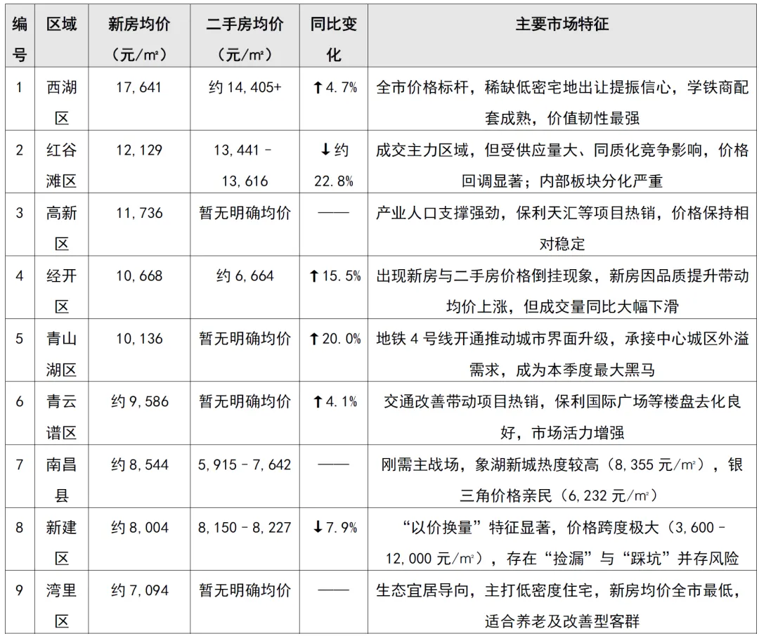 受市场整体调整影响,红谷滩区(含九龙湖)住宅价格承压明显,2026年一季度挂牌均价较2025年同期回落约22.8%,反映出供应量大、同质化竞争加剧与购房者预期理性回归的多重作用。此外,区域内部分化特征突出:核心板块如凤凰洲、中央商务区仍聚集优质资源,高端项目如邦泰·璟和可达25,000元/㎡以上;而九龙湖新城等新兴板块受制于配套成熟度与时效,新房均价普遍在11,000–15,600元/㎡区间波动;
