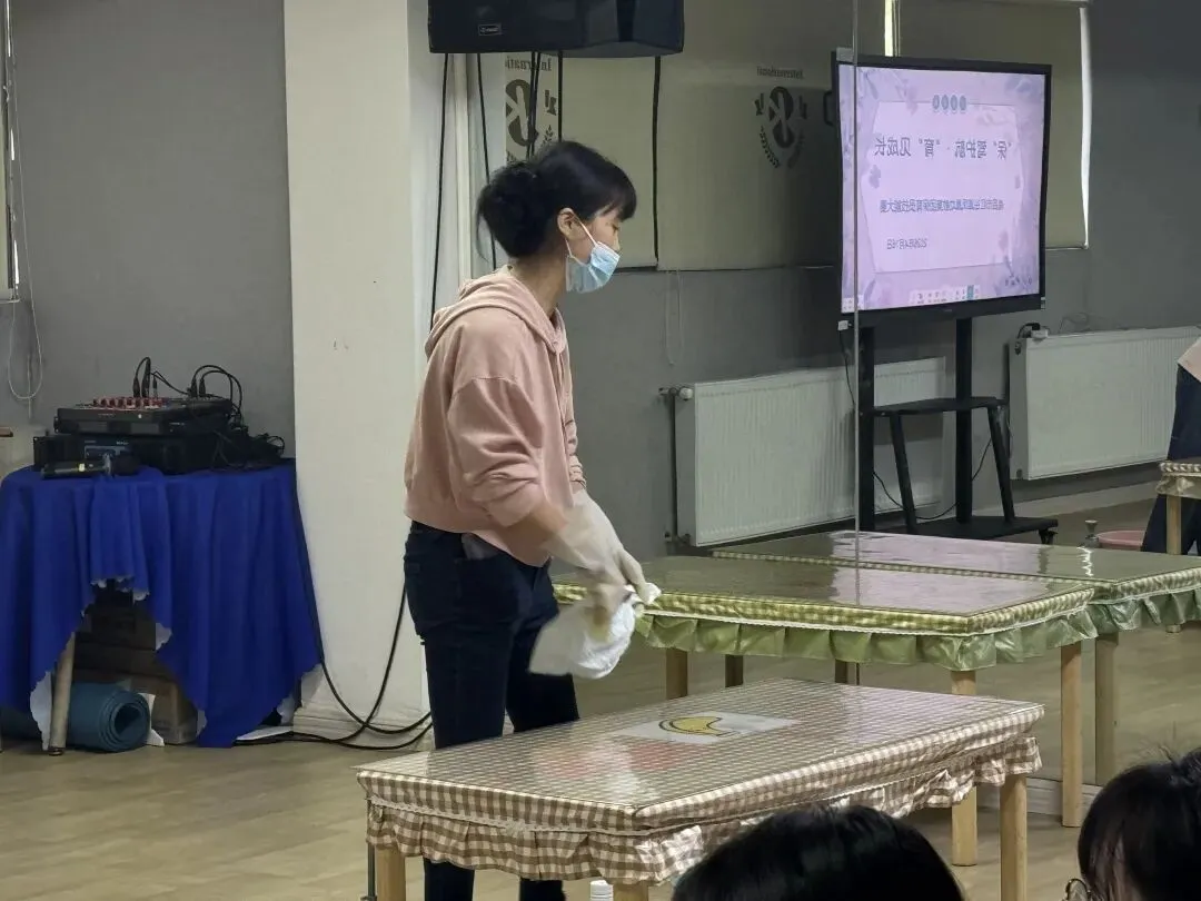 比赛项目是根据保育团队现有的水平,分两层进行考核,成熟型保育员参赛项目是保育员工作经验分享,成长型的新保育员参赛项目是技能实操(桌面消毒、叠毛巾、整理床铺、呕吐物处理。