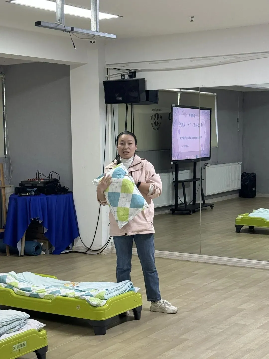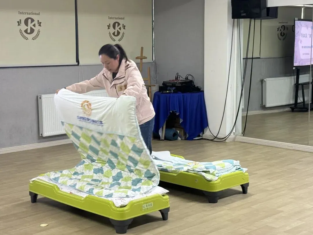 被子三折、园标朝上,床铺平整整洁,尽显日常功底。每一个动作、每一步流程,都体现着保育员们日复一日的专业积累与严谨态度。