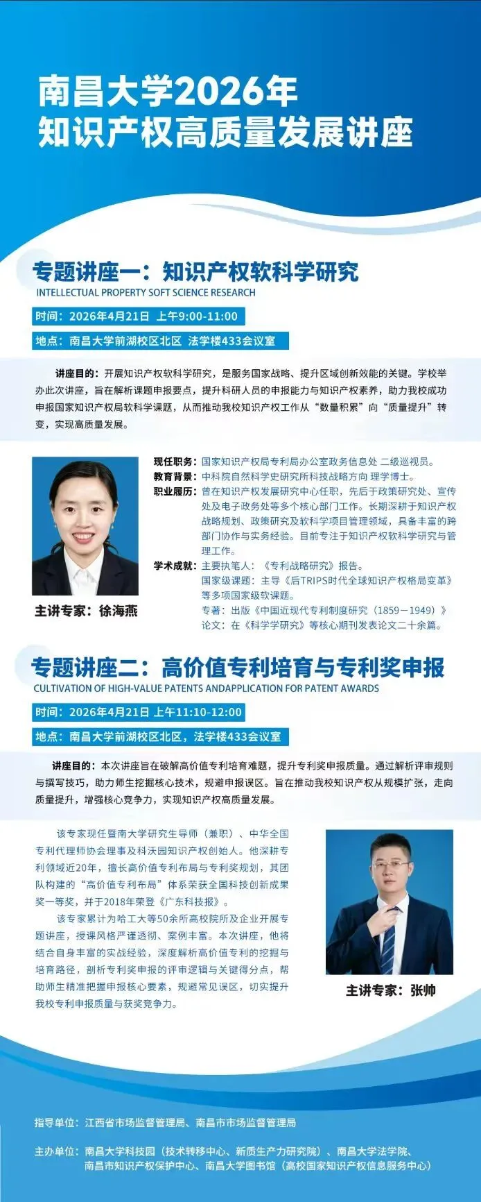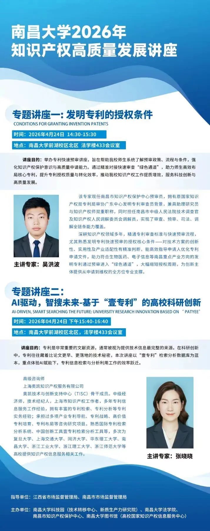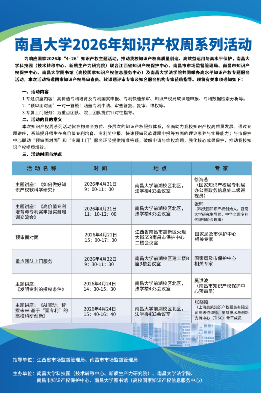 为响应国家2026年"4.26"知识产权主题活动,推动我知识产权高质量创造,高效益运用与高水平保护,南昌大学科技园(技术转移中心,新质生产力研究院)联合江西省知识产权保护中心,南昌市市场监督管理局,南昌市知识产权保护中心,南昌大学图书馆(高校国家知识产权信息服务中心)及南昌大学法学院共同举办高水平知识产权专题服务活动。本次活动特邀国家知识产权局审查员,软课题评审专家及知名服务机构专家莅临指导。欢迎广大师生积极参与!
