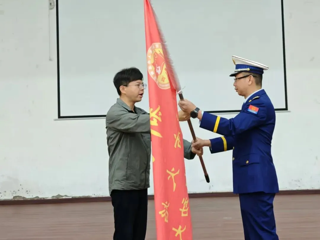 仪式伊始,主持人详细介绍了大队的组建背景与核心使命。随后,南昌市退役军人事务局李伟副局长致辞,充分肯定消防志愿服务在社会应急体系中的重要作用,寄语大队传承军人本色与过硬作风,发挥专业优势,将消防安全服务融入志愿服务,用实干守护英雄城平安。南昌消防救援机动支队二级督导员王晋龙围绕“牢记宗旨、苦练本领、严明纪律”提出期望,强调将统筹专业资源,为志愿服务提供坚实技术与装备支撑,推动消防宣传“五进”走深走实。志愿者代表上台表态发言,承诺将当好消防安全“宣传员”、应急技能“教练员”、基层一线“服务员”、志愿精神“传递员”,以实际行动践行志愿精神,勇担新时代使命。随后,南昌市退役军人事务局副局长李伟为大队授旗,鲜艳队旗承载起守护平安的使命与担当,现场氛围庄重热烈。仪式结束后,全体人员合影留念,定格这一重要时刻。