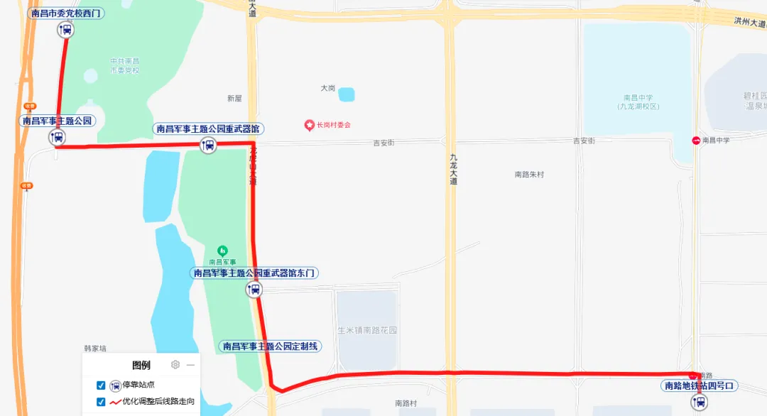 5.沿途站点:南路地铁站四号口、南昌军事主题公园重武器馆东门、南昌军事主题公园重武器馆、南昌军事主题公园、南昌市委党校西门;