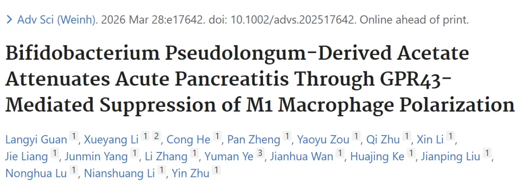 #假长双歧杆菌#乙酸#急性胰腺炎#GPR43#巨噬细胞极化#肠道菌群#短链脂肪酸#胰腺损伤