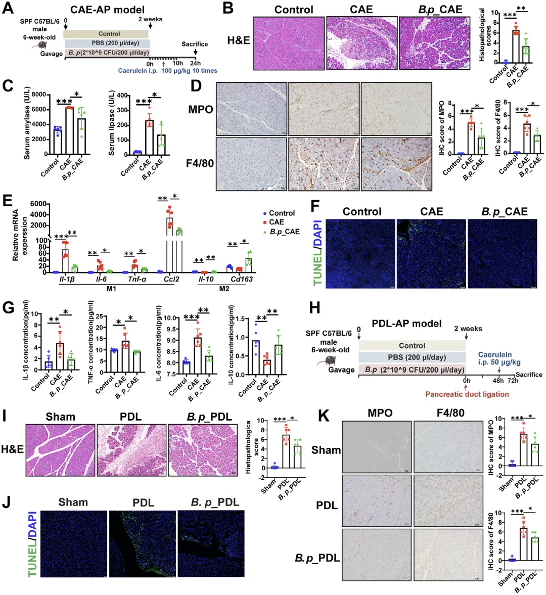这张图通过雨蛙素诱导与胰管结扎诱导的两种急性胰腺炎小鼠模型,系统证明假长双歧杆菌干预能够显著减轻胰腺的病理损伤,具体表现为胰腺组织的水肿、炎症浸润与腺泡细胞坏死明显减少,血清淀粉酶与脂肪酶水平显著下降,同时胰腺组织中髓过氧化物酶活性、巨噬细胞浸润以及细胞凋亡水平均明显降低;在分子层面,假长双歧杆菌处理后胰腺组织中促炎的 M1 型巨噬细胞相关因子表达下调,抗炎的 M2 型巨噬细胞相关因子表达上升,血清中促炎细胞因子水平降低、抗炎细胞因子水平升高,并且在急性胰腺炎恢复期模型中,假长双歧杆菌不仅能在早期抑制炎症,还能在后期促进胰腺组织修复与结构恢复,充分证实该菌株对轻、重症急性胰腺炎均具有明确的保护作用。