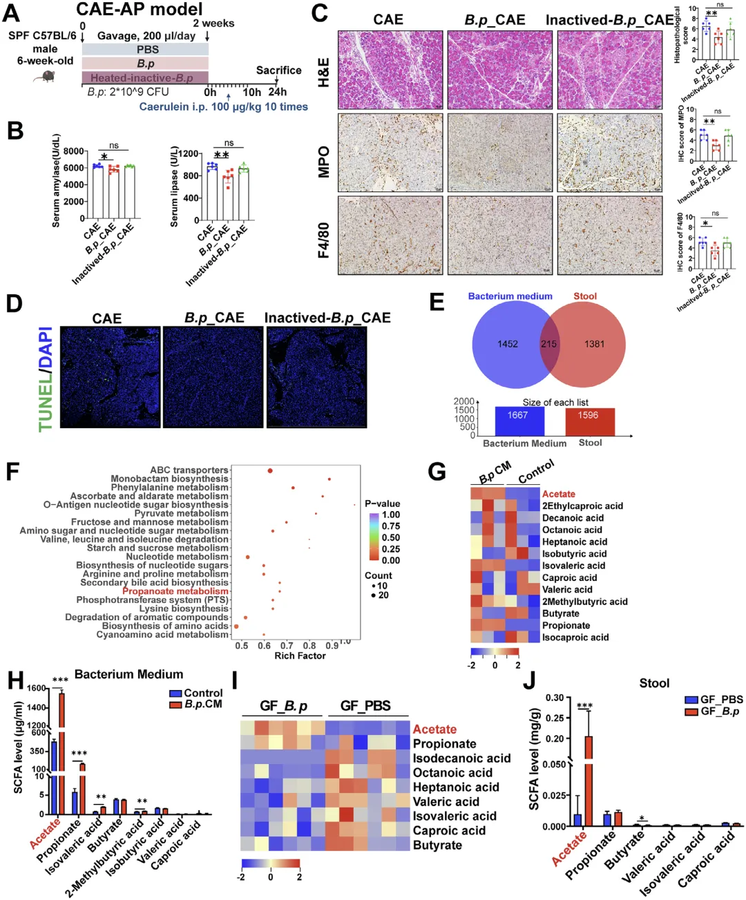 该图首先通过活菌与热灭活菌对比实验,发现只有活的假长双歧杆菌才能有效减轻小鼠胰腺损伤、降低炎症指标与细胞凋亡,热灭活后保护作用大幅减弱,提示其保护效应依赖活菌产生的可溶性代谢物;随后利用非靶向代谢组学对细菌培养上清与无菌小鼠粪便进行分析,筛选出两者共同差异表达的代谢物,结合 KEGG 通路富集与短链脂肪酸靶向检测,确定乙酸是假长双歧杆菌产生的最主要差异短链脂肪酸,且在无菌小鼠粪便中乙酸含量显著升高,明确乙酸是介导假长双歧杆菌发挥抗急性胰腺炎作用的核心功能代谢物。
