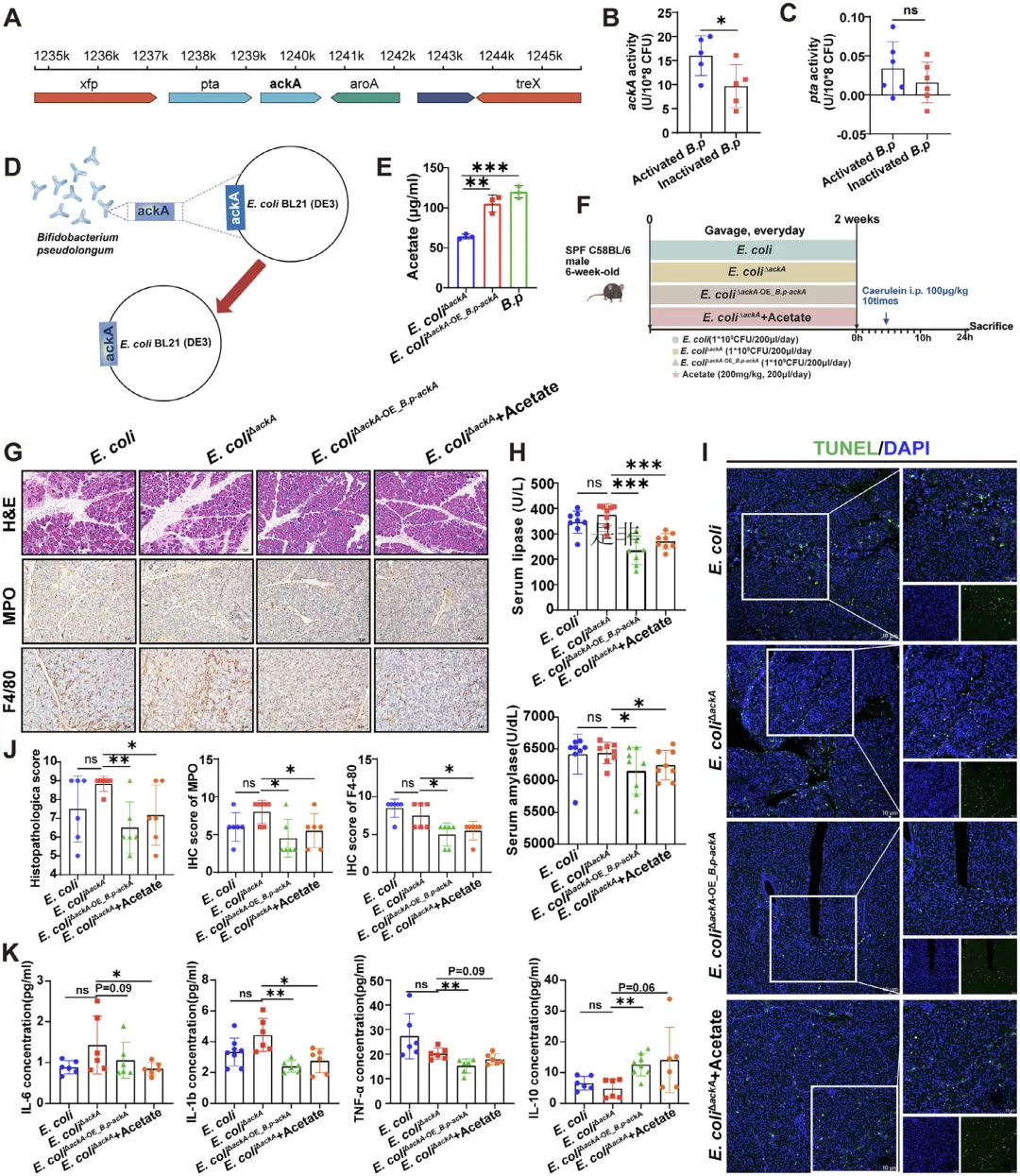 这张图从基因组层面、酶活性层面与功能验证层面,全面证实 ackA 基因对假长双歧杆菌合成乙酸至关重要,首先基因组测序显示假长双歧杆菌含有乙酸合成关键基因 pta 与 ackA,且热灭活后 ackA 酶活性显著降低而 pta 酶活性无明显变化;通过构建 ackA 缺失的大肠杆菌工程菌株,并回补假长双歧杆菌的 ackA 基因,发现回补菌株可恢复乙酸合成能力,在急性胰腺炎小鼠模型中,回补 ackA 基因的工程菌可显著减轻胰腺损伤、降低炎症因子与酶学指标,单独补充乙酸也能达到类似保护效果,直接证明 ackA 基因是假长双歧杆菌合成乙酸、进而缓解急性胰腺炎的必需基因。