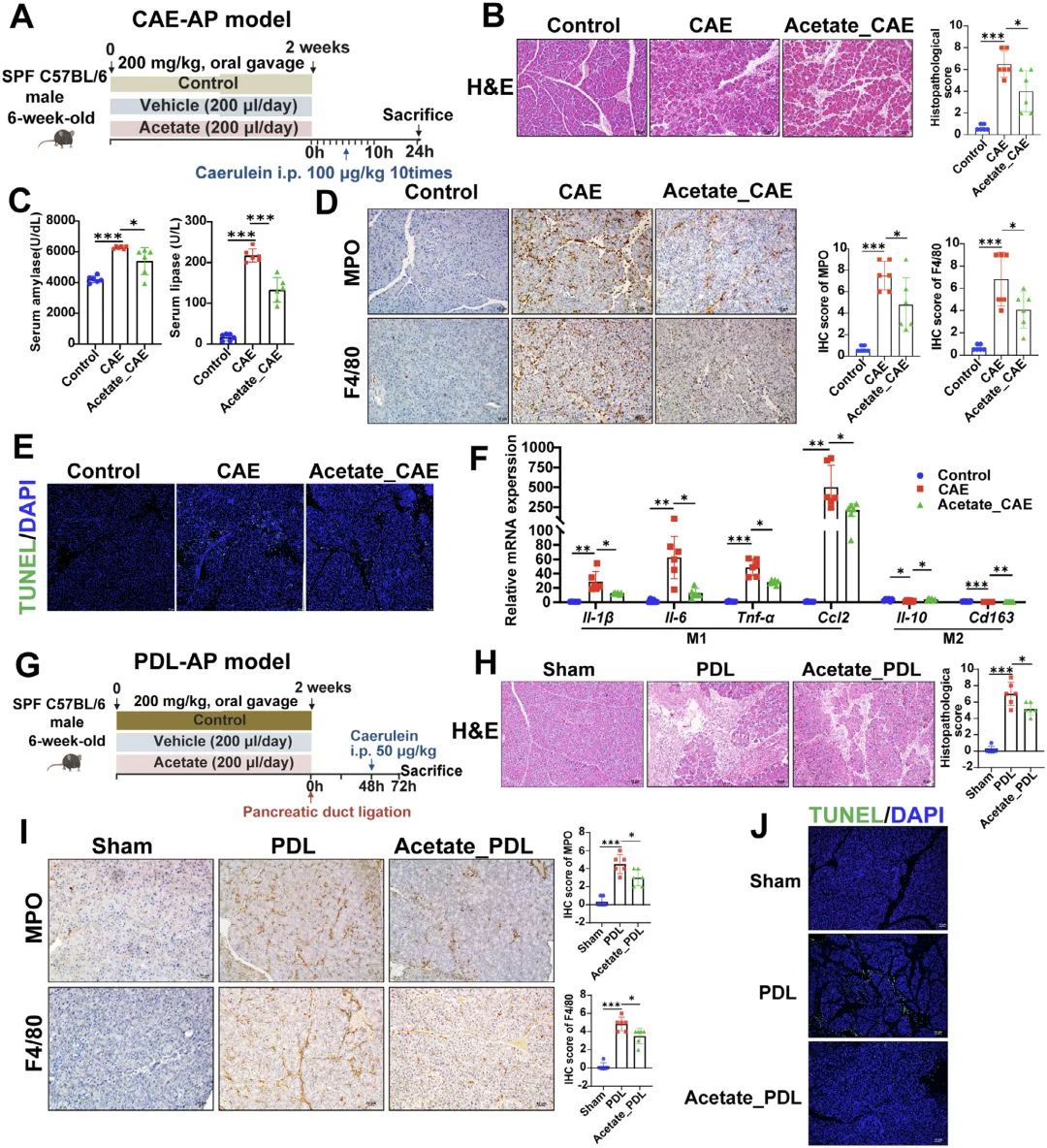 该图直接验证乙酸作为效应分子的功能,在雨蛙素与胰管结扎两种急性胰腺炎模型中,单独给予乙酸干预均可显著降低小鼠胰腺病理损伤评分、血清淀粉酶与脂肪酶水平,减少胰腺组织中性粒细胞与巨噬细胞浸润、抑制细胞凋亡,同时调控巨噬细胞极化相关因子表达,整体效果与假长双歧杆菌干预高度一致;此外乙酸还能改善急性胰腺炎小鼠的肠道屏障功能,提升紧密连接蛋白表达、降低肠道通透性,减少肠道黏膜损伤与杯状细胞丢失,上调肠道抗菌肽表达,充分说明乙酸能够完全模拟假长双歧杆菌的保护作用,是其发挥效应的核心物质。
