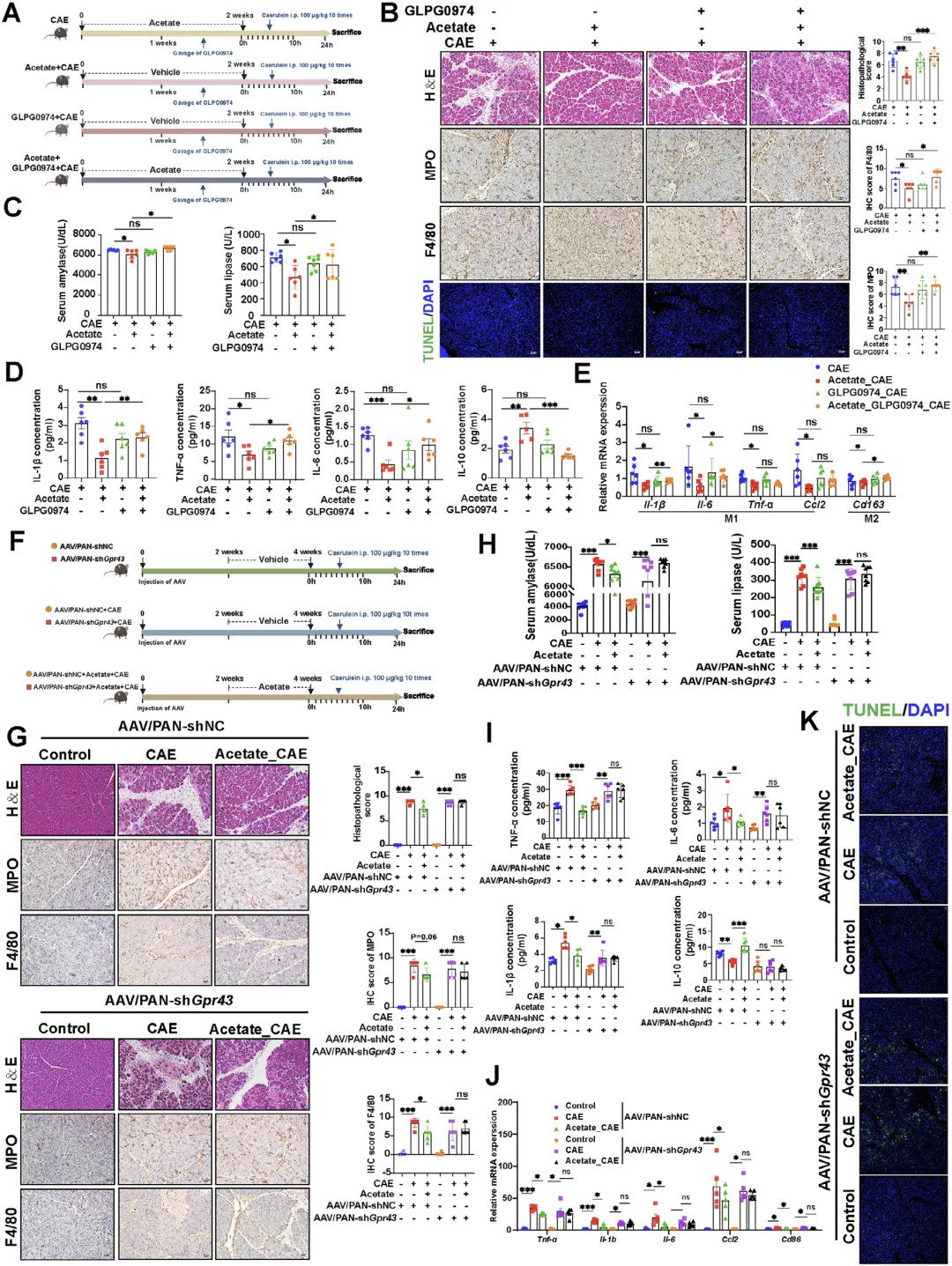 这张图通过受体拮抗、基因敲除与胰腺特异性沉默等手段,明确 GPR43 介导乙酸的抗急性胰腺炎作用,使用 GPR43 特异性拮抗剂 GLPG0974 后,乙酸对胰腺损伤、炎症浸润、细胞凋亡的改善作用完全消失,血清炎症指标与胰腺组织炎症因子表达恢复至模型水平;GPR41/GPR43 双敲除小鼠中,乙酸无法发挥保护效应,胰腺特异性敲低 GPR43 也会逆转乙酸的治疗效果,证实乙酸必须结合 GPR43 受体才能抑制炎症、减轻胰腺损伤,GPR43 是乙酸发挥作用的必需下游靶点。