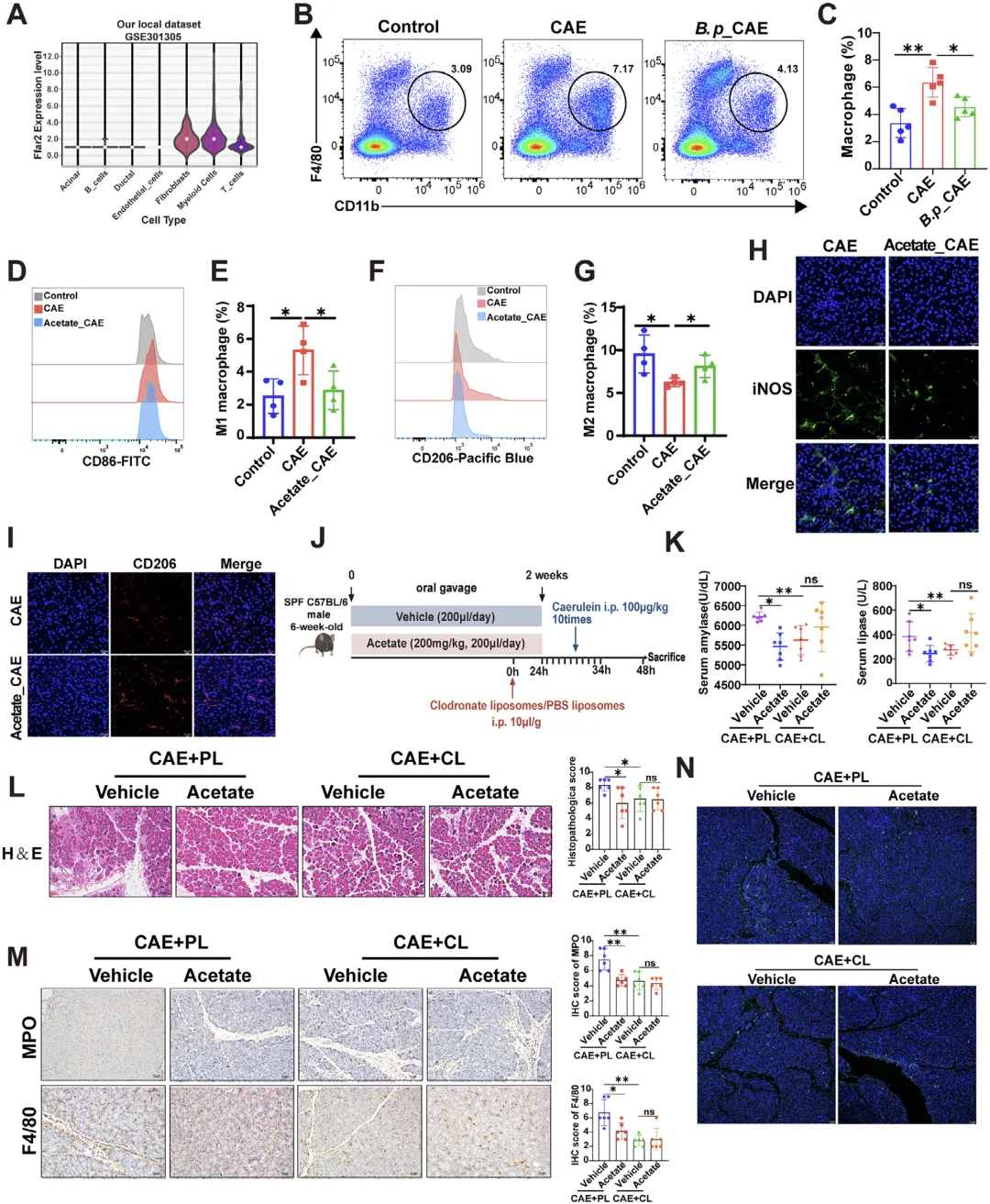 本研究采用基础动物实验、细胞实验与临床样本验证相结合的策略:动物层面构建雨蛙素诱导、胰管结扎诱导及恢复期急性胰腺炎小鼠模型,设置假长双歧杆菌灌胃、乙酸干预、GPR43 拮抗剂处理、巨噬细胞清除、基因敲除 / 过表达等分组;利用无菌小鼠验证菌群非依赖效应;通过 16S rRNA 测序分析肠道菌群结构,非靶向与靶向代谢组学筛选功能代谢物;基因编辑构建 ackA 基因工程菌验证合成关键基因;细胞实验采用 THP-1、RAW264.7 及原代骨髓巨噬细胞,探究乙酸 / GPR43 对巨噬细胞极化与炎症通路的影响;临床层面收集健康对照与不同严重程度急性胰腺炎患者粪便样本,定量检测假长双歧杆菌与乙酸水平并做相关性分析;配套使用病理染色、ELISA、qPCR、Western blot、流式细胞术、免疫荧光等技术完成指标检测与机制验证。