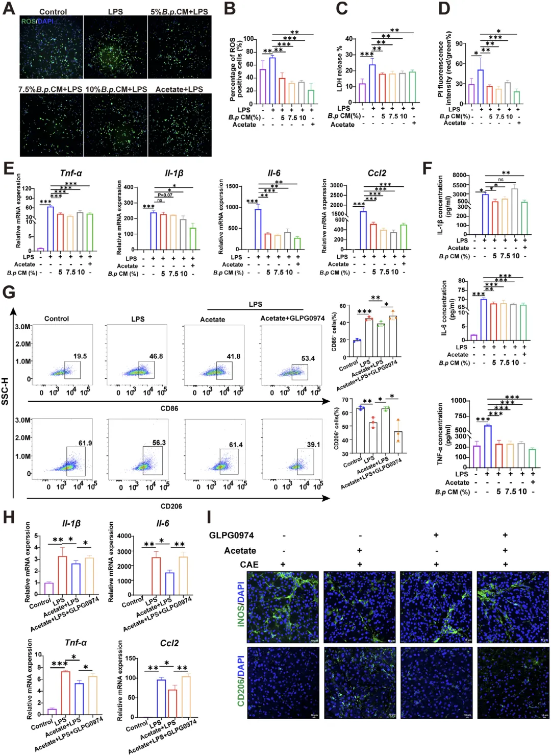 这张图在细胞水平深入解析乙酸调控巨噬细胞极化的分子机制,在 LPS 激活的 THP-1 巨噬细胞与小鼠原代骨髓巨噬细胞中,乙酸及假长双歧杆菌培养上清可显著降低细胞活性氧水平、减少细胞损伤与死亡,抑制 M1 型促炎因子表达;GPR43 拮抗剂处理或 GPR41/GPR43 敲除后,乙酸无法抑制巨噬细胞 M1 极化,下游 JNK、NF-κB p65、STAT1 通路的磷酸化水平也不再被下调,体内免疫荧光也验证乙酸可降低胰腺组织 iNOS 阳性 M1 型巨噬细胞、升高 CD206 阳性 M2 型巨噬细胞,该效应依赖 GPR43,完整揭示乙酸通过 GPR43 调控巨噬细胞极化、抑制炎症信号的分子机制。