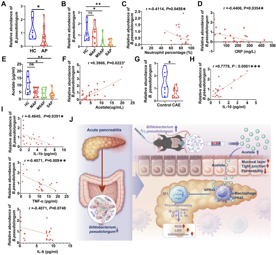 该图完成基础研究向临床转化的关键验证,临床样本检测显示,与健康人群相比,急性胰腺炎患者粪便中假长双歧杆菌丰度显著下降,且在中重症、重症患者中降低更明显,其丰度与患者中性粒细胞比例、C 反应蛋白水平呈显著负相关;同时患者粪便乙酸水平也显著降低,与假长双歧杆菌丰度呈正相关;在急性胰腺炎小鼠模型中也观察到一致的变化,粪便假长双歧杆菌减少,且其丰度与血清抗炎因子 IL-10 正相关、与促炎因子负相关,证实假长双歧杆菌 - 乙酸轴异常与急性胰腺炎发生发展密切相关,具有重要的临床病理意义