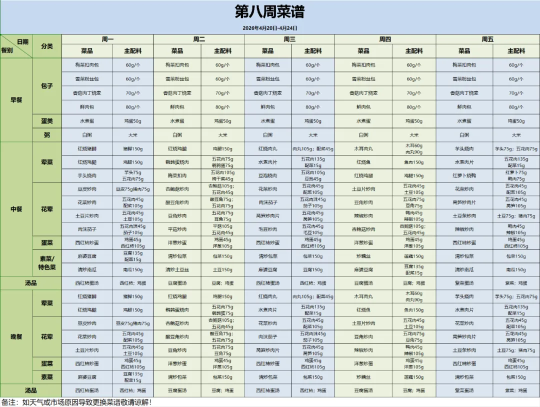 南昌市汽车机电学校第8周菜谱