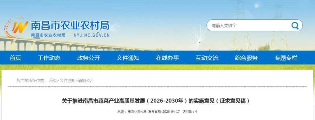 为进一步推动南昌市蔬菜产业高质量发展,我局编制了《关于推进南昌市蔬菜产业高质量发展(2026-2030年)的实施意见(征求意见稿)》,现向社会公开征求意见。如有意见建议,请于2026年5月17日前将意见建议(单位需加盖公章)通过电子邮件向我局反映,并注明姓名、单位及联系方式。