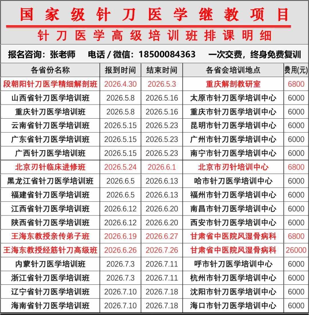 下 肢 部 | ①针刀治疗膝关节内侧副韧带损伤 ②针刀治疗髌韧带损伤 ③针刀治疗膝关节骨性关节炎的诊断与治疗方法 ④针刀治疗髌下脂肪垫炎 ⑤针刀治疗髌骨软化症 ⑥针刀治疗跖管综合症 ⑦针刀治疗跟骨骨刺 ⑧针刀门诊治疗、示教 | 第七天(全天) 星期五 |