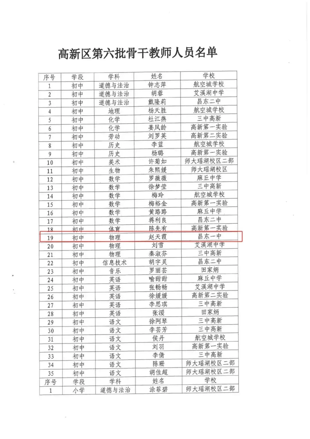 在近期开展的南昌高新区第六批中小学(幼儿园)优秀青年骨干教师评选活动中,经学校审核、区里复审、笔试、教学技能展示等环节的评选,我校赵天霞老师成功入选南昌高新区第六批骨干教师。