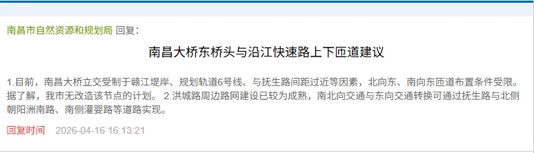 近日,有网友针对南昌大桥东桥头与沿江快速路的上下匝道问题,向相关部门提出咨询: