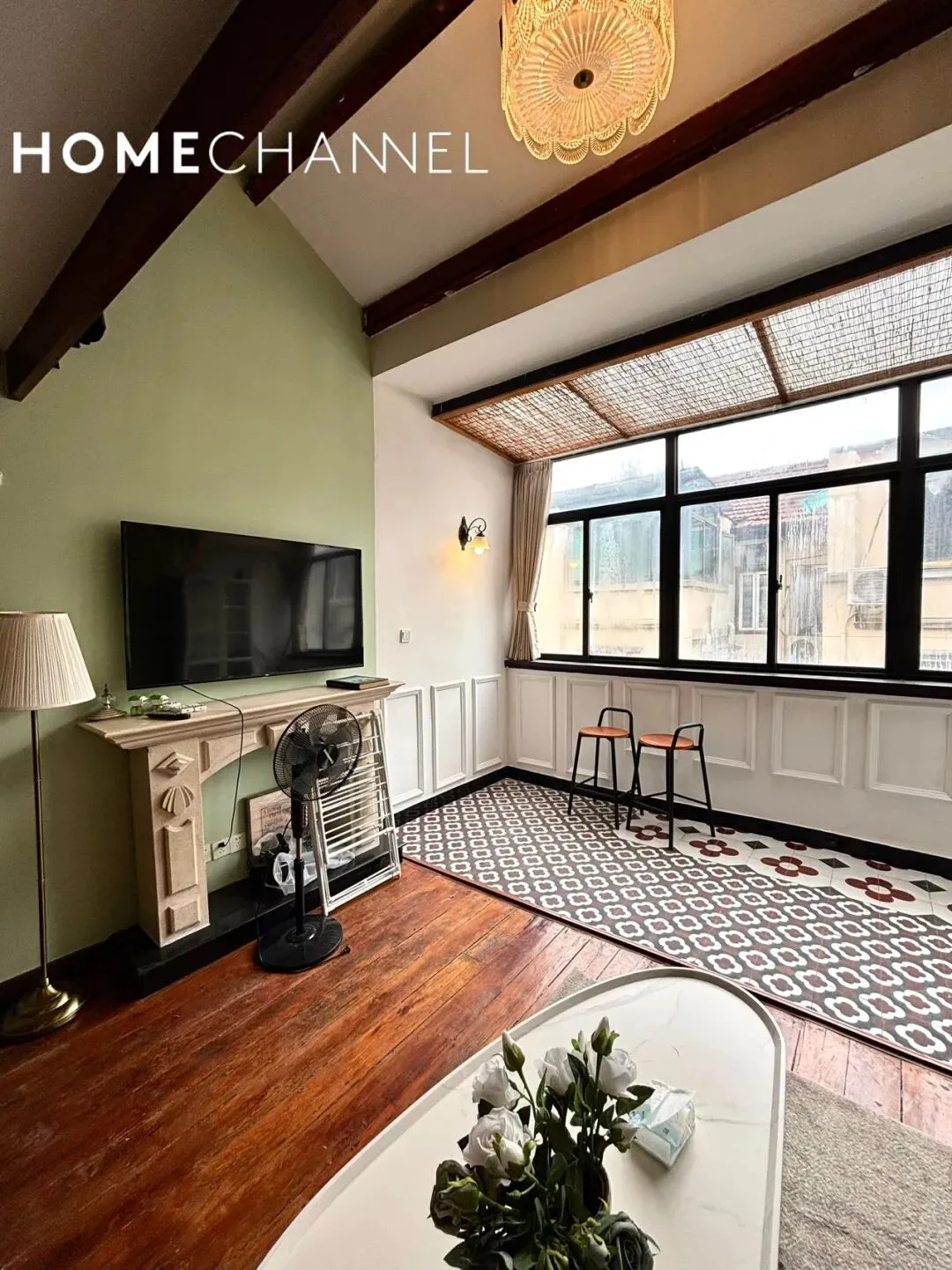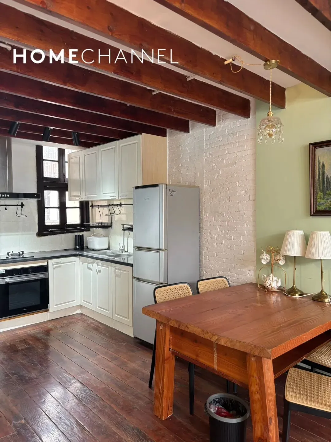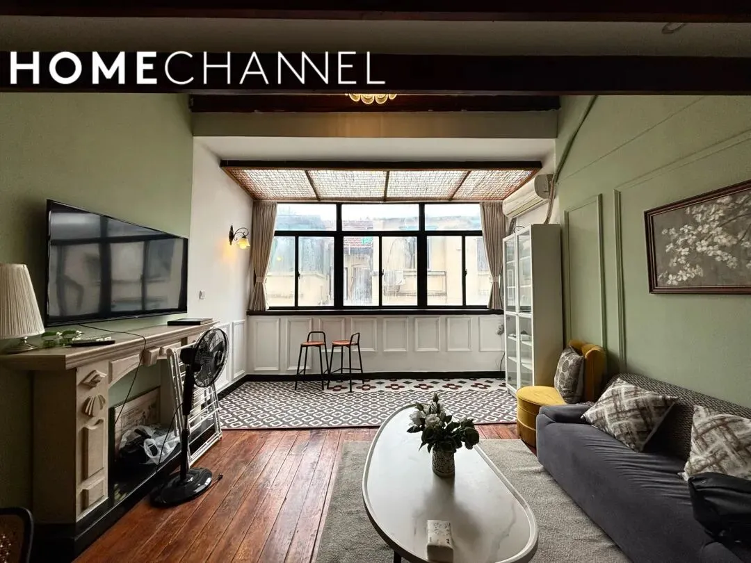 位于南昌路136弄的老洋房,面积80平2房2厅1卫,价格13000元/月,保留原始坡顶+裸露深色木梁,层高开阔无压抑感,低饱和莫兰迪绿墙面搭配白色护墙板,复古花纹花砖与实木地板拼接,搭配做旧壁炉造型与水晶吊灯,还原老上海洋房的优雅质感,配有墙暖和美丽露台;1号线淮海中路站及周边等购物街繁华地段,地理位置优越,很适合住家的美屋,欢迎来预约!The lane houseis located on NanChang Road lane 136 in the HuangPu District.The main house has 2 bedrooms and 1 bathroom with delicate and graceful interior decoration,size 80 sqm and price 13000RMB/Month with radiator、terrace,and this is a comfortable place as home.▼超酷尖顶原木梁的客餐厅 、开放式厨房