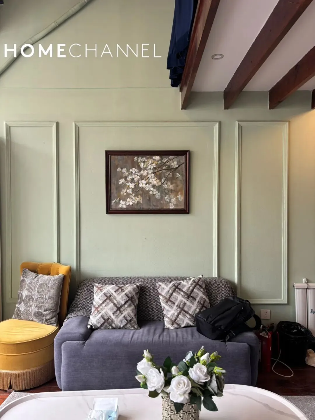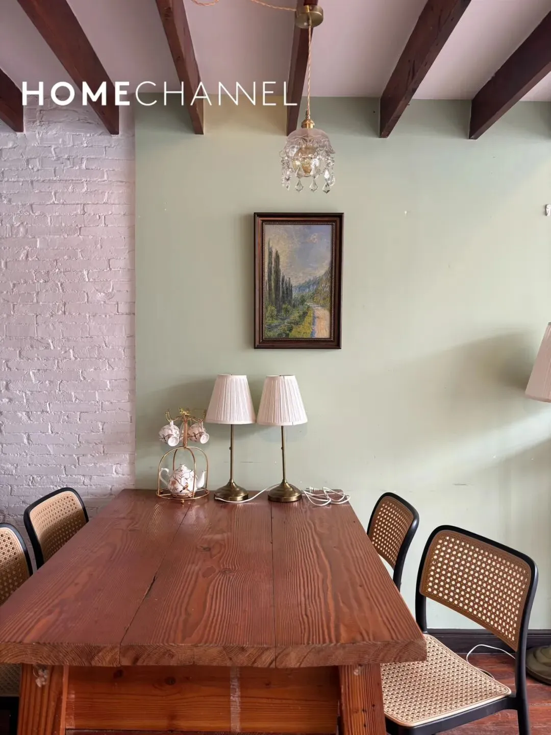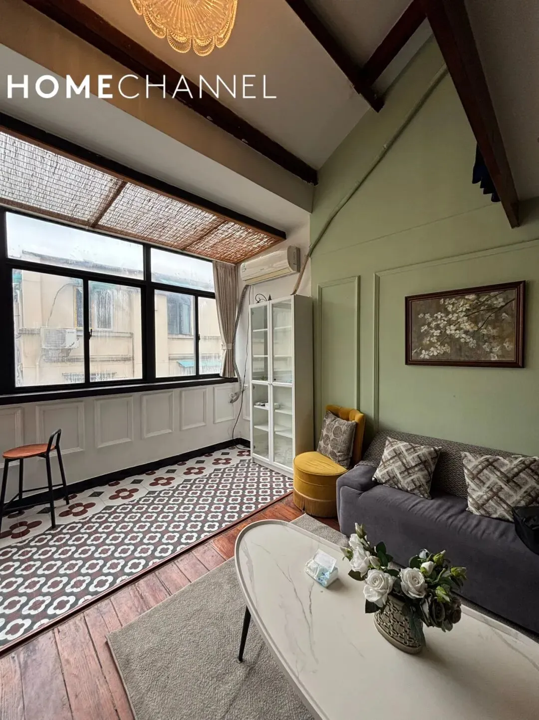 位于南昌路136弄的老洋房,面积80平2房2厅1卫,价格13000元/月,保留原始坡顶+裸露深色木梁,层高开阔无压抑感,低饱和莫兰迪绿墙面搭配白色护墙板,复古花纹花砖与实木地板拼接,搭配做旧壁炉造型与水晶吊灯,还原老上海洋房的优雅质感,配有墙暖和美丽露台;1号线淮海中路站及周边等购物街繁华地段,地理位置优越,很适合住家的美屋,欢迎来预约!The lane houseis located on NanChang Road lane 136 in the HuangPu District.The main house has 2 bedrooms and 1 bathroom with delicate and graceful interior decoration,size 80 sqm and price 13000RMB/Month with radiator、terrace,and this is a comfortable place as home.▼超酷尖顶原木梁的客餐厅 、开放式厨房