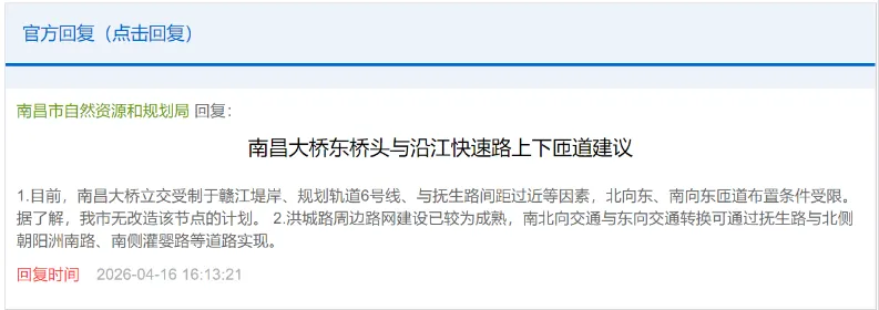 1.目前,南昌大桥立交受制于赣江堤岸、规划轨道6号线、与抚生路间距过近等因素,北向东、南向东匝道布置条件受限。据了解,我市无改造该节点的计划。