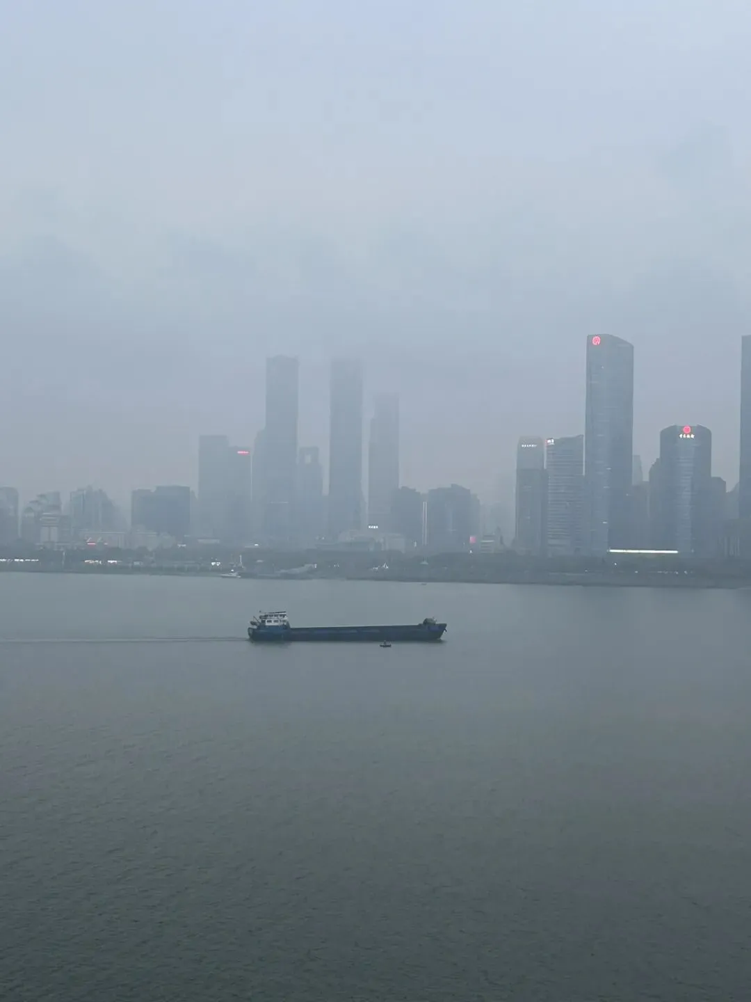 站在6楼的外面,往湖面一看,因为雨雾天,没有“落霞与孤鹜齐飞秋水共长天一色”,就是大雾大雨,有点像重庆雾都的感觉~