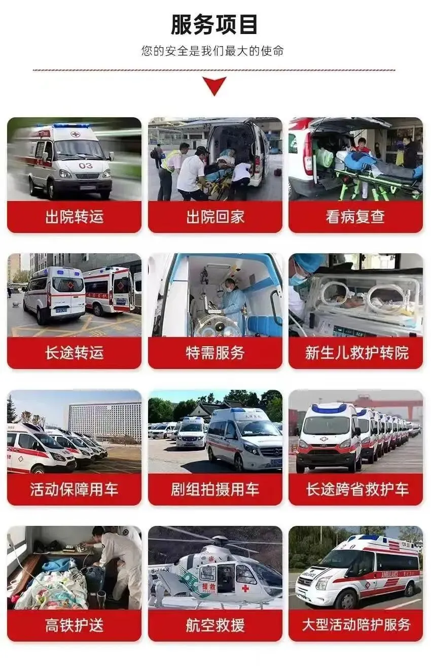 【服务内容】术后康复病人、慢性病稳定期病人、骨折卧床病人、瘫痪失能病人、重症监护转院病人、心脑血管疾病病人、呼吸衰竭病人、高龄体弱老人、孕产妇、新生儿及早产儿、临终关怀病人、长途返乡就医病人承接遗体运送返乡