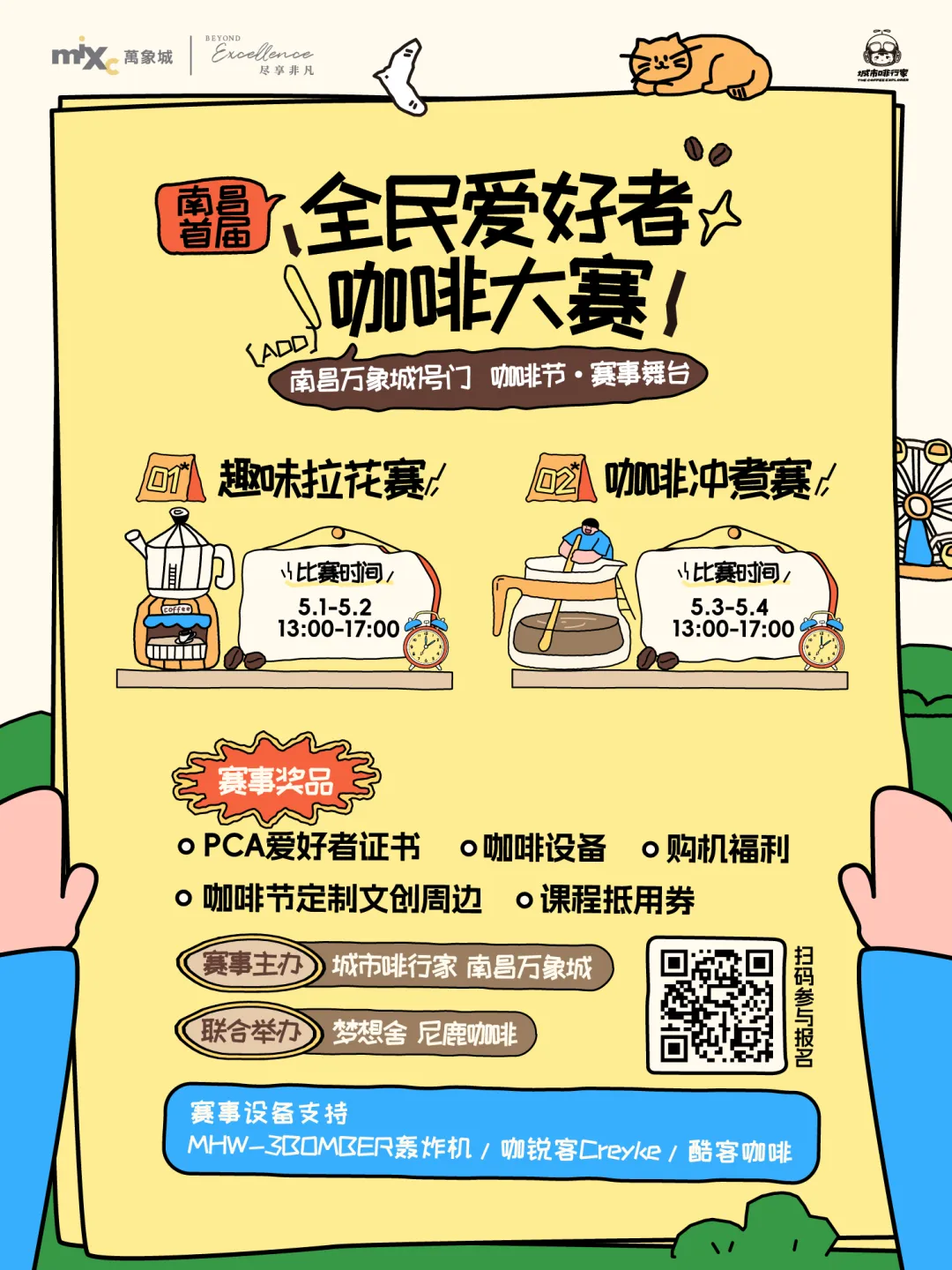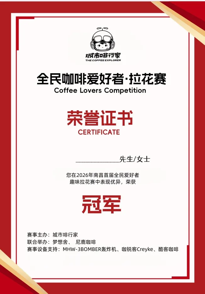 △ 扫码即刻报名,入选即可获得咖啡节定制帆布袋1个在今年南昌城市咖啡节3.0的现场,城市啡行家将联合南昌咖啡供应链头部品牌——尼鹿咖啡,携手MHW-3BOMBER轰炸机、咖锐客Creyke和酷客咖啡一道,共同带来南昌首届“全民爱好者咖啡大赛”!5月1日-4日,连续4天——趣味拉花与咖啡冲煮两项赛事,每2天一场属于“咖啡爱好者”们的PK舞台。我们会为所有咖啡爱好者打造一个公平、开放、专业的“切磋”平台,丰富好玩的赛制,快来层层闯关,争夺属于你领域里的冠军荣耀!!本次大赛包含两项独立赛事——趣味拉花赛和咖啡冲煮赛。赛事均采取16人制单败淘汰赛,两两PK,胜者晋级,紧张刺激!