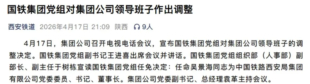2026年4月17日,集团公司召开电视电话会议,宣布国铁集团党组对集团公司领导班子的调整决定。国铁集团党组副书记王进喜出席会议并讲话。国铁集团党组组织部(人事部)副部长、副主任于树栋宣读国铁集团党组任免决定:任命吴景海同志为中国铁路西安局集团有限公司党委委员、书记、董事长。