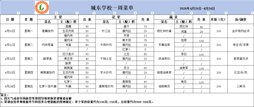 【每周食谱】南昌县城东学校健康带量食谱(2026年4月20日-4月24日)