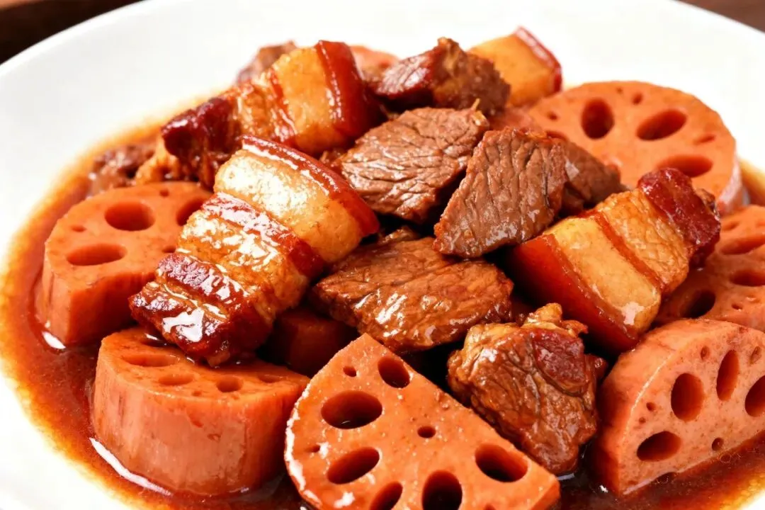 主荤:莲藕烧肉(莲藕80克、五花肉块50克、瘦肉块20克)