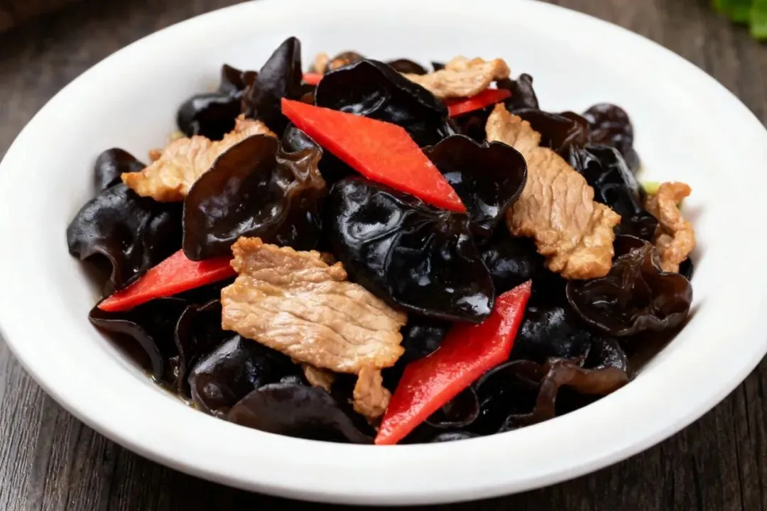花荤:木耳炒肉(黑木耳75克、瘦肉丝20克、红萝卜5克)
