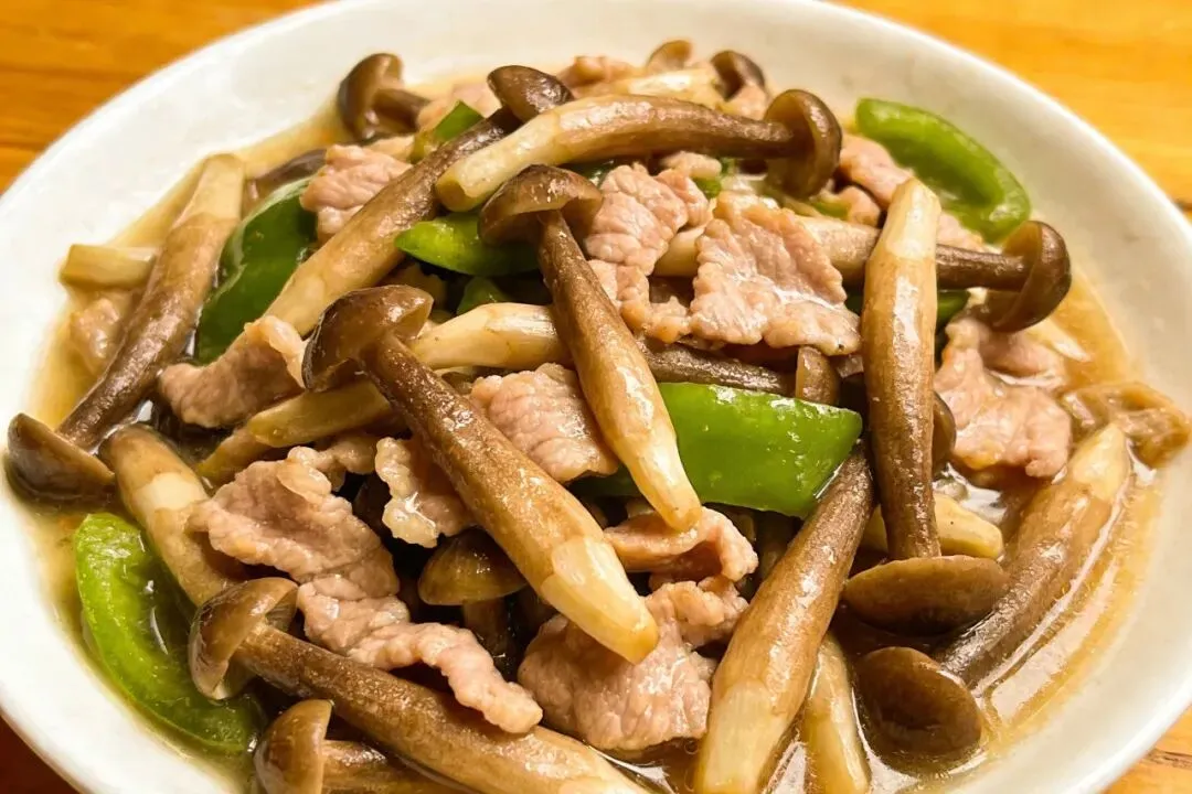 花荤:鹿茸菇炒肉(鹿茸菇80克、瘦肉丝20克)