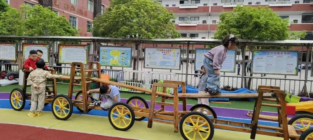 理论学习后,全体教师共同走进现场,观摩由周叶、简佩英老师组织的户外自主游戏——开心游乐场。