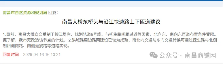 近日,有网友针对南昌大桥东桥头与沿江快速路的上下匝道问题,向相关部门提出咨询:“南昌大桥东桥头西往东不可以直接通过匝道通往红谷隧道方向,沿江大道北往南无法通过匝道往坛子口方向,洪城路东往西无法直接通过匝道上沿江大道北往南方向,严重制约了城市的发展,目前是否有规划,新建几处匝道,优化南昌的交通网。”针对市民提出的问题,南昌市自然资源和规划局作出公开官方答复。部门在回复中明确:因受赣江堤岸限制、规划轨道 6 号线布局影响,以及现状道路与抚生路间距不足,南昌大桥北向东、南向东匝道不具备增设改造条件,该节点暂无改造计划。同时建议,周边交通转换可绕行抚生路、朝阳洲南路、灌婴路通行。从这份答复中,我们可以读出关键信息:官方答复已坐实南昌大桥片区地铁 6 号线规划,该节点需为线路预留条件,暂无匝道改造计划。未来地铁 6 号线将承担片区跨江通勤压力,串联城西板块,为市民提供稳定的公共交通支撑。作为南昌重点谋划的轨道交通线路,地铁 6 号线串联湾里、新建、红谷滩、西湖、朝阳等多个片区。此次官方明确选址预留,也意味着线路推进再进一步,片区公共交通发展迎来明确利好。南昌招聘群 南昌交友群 南昌出租群 南昌本地生活群,扫上面客服微信二维码加客服微信 让客服拉你进群你若喜欢,别忘了点个在看哦
