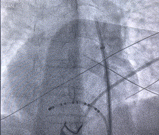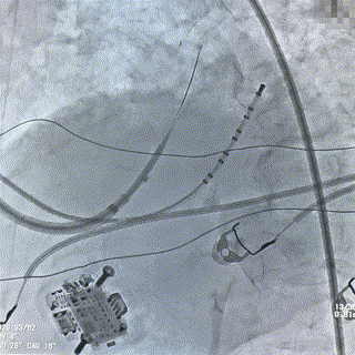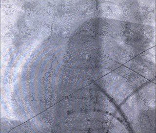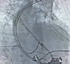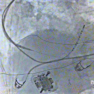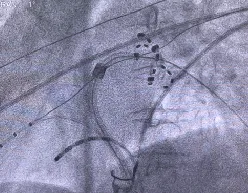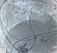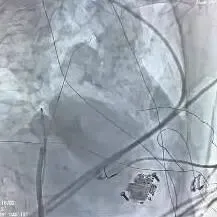 术中造影显示患者下腔静脉极度迂曲,无法经下腔静脉途径送入导管。团队果断改为左腋静脉入路,使用AccuSafe穿刺导丝联合Navigo 8.5Fr可调弯鞘进行房间隔穿刺,并采用本中心首创的Y阀造影剂显影方法确认进入左房。术中借助可调弯鞘灵活适配至上腔静脉入路角度,实现与房间隔稳定贴靠;依托穿刺导丝的滑脱保护及穿刺兼导引的双重安全特性,避免了误穿心包、主动脉及鞘管前冲损伤,在X线引导下精准、安全完成穿间隔操作,充分体现了团队的娴熟技术与应变能力。随后送入Farapulse PFA导管,对双侧肺静脉及上腔静脉进行消融隔离,共放电37次,验证完全阻断,手术获得成功(见图4)。