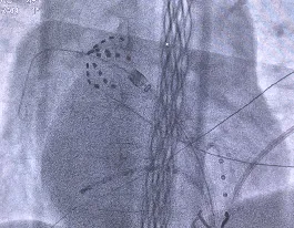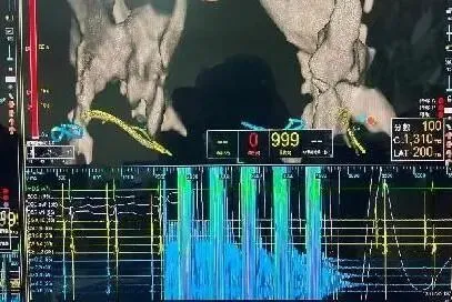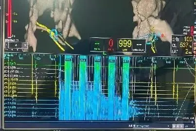 脊柱畸形患者CT图像(左)、术中下腔静脉影像(中)、电生理团队实施经左腋静脉入路PFA手术(右)