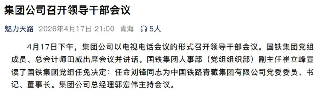 2026年4月17日下午,集团公司以电视电话会议的形式召开领导干部会议。国铁集团党组成员、总会计师田威出席会议并讲话。国铁集团人事部(党组组织部)副主任崔立峰宣读了国铁集团党组任免决定:任命刘锋同志为中国铁路青藏集团有限公司党委委员、书记、董事长。