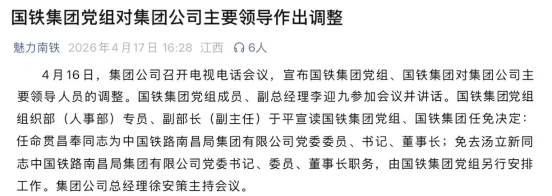 2026年4月16日,国铁集团公司召开电视电话会议,宣布国铁集团党组、国铁集团对集团公司主要领导人员的调整。国铁集团任免决定:任命贯昌奉同志为中国铁路南昌局集团有限公司党委委员、书记、董事长;免去汤立新同志中国铁路南昌局集团有限公司党委书记、委员、董事长职务,由国铁集团党组另行安排工作。